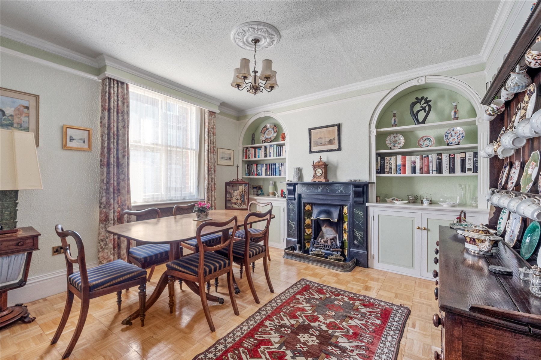 The separate DINING ROOM, located at the front, exudes warmth with its open fire nestled within a Victorian fireplace, complete with a tiled hearth, surround, and mantle. High ceilings and morning light enhance the room's elegance, while parquet flooring adds sophistication. The room is thoughtfully designed with display shelving and cupboards flanking the chimney breast, providing delightful storage and display options. Ample space allows for family gatherings and formal meals.
