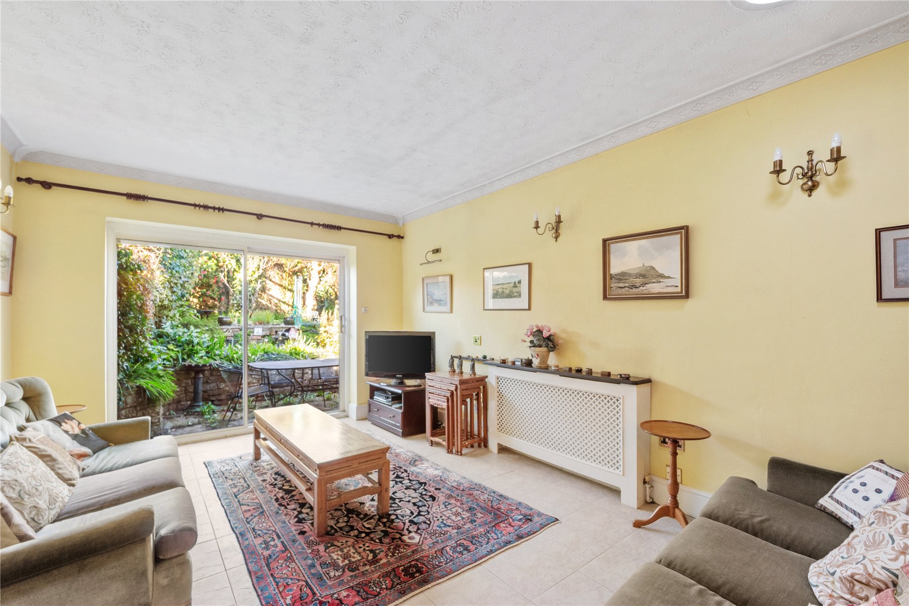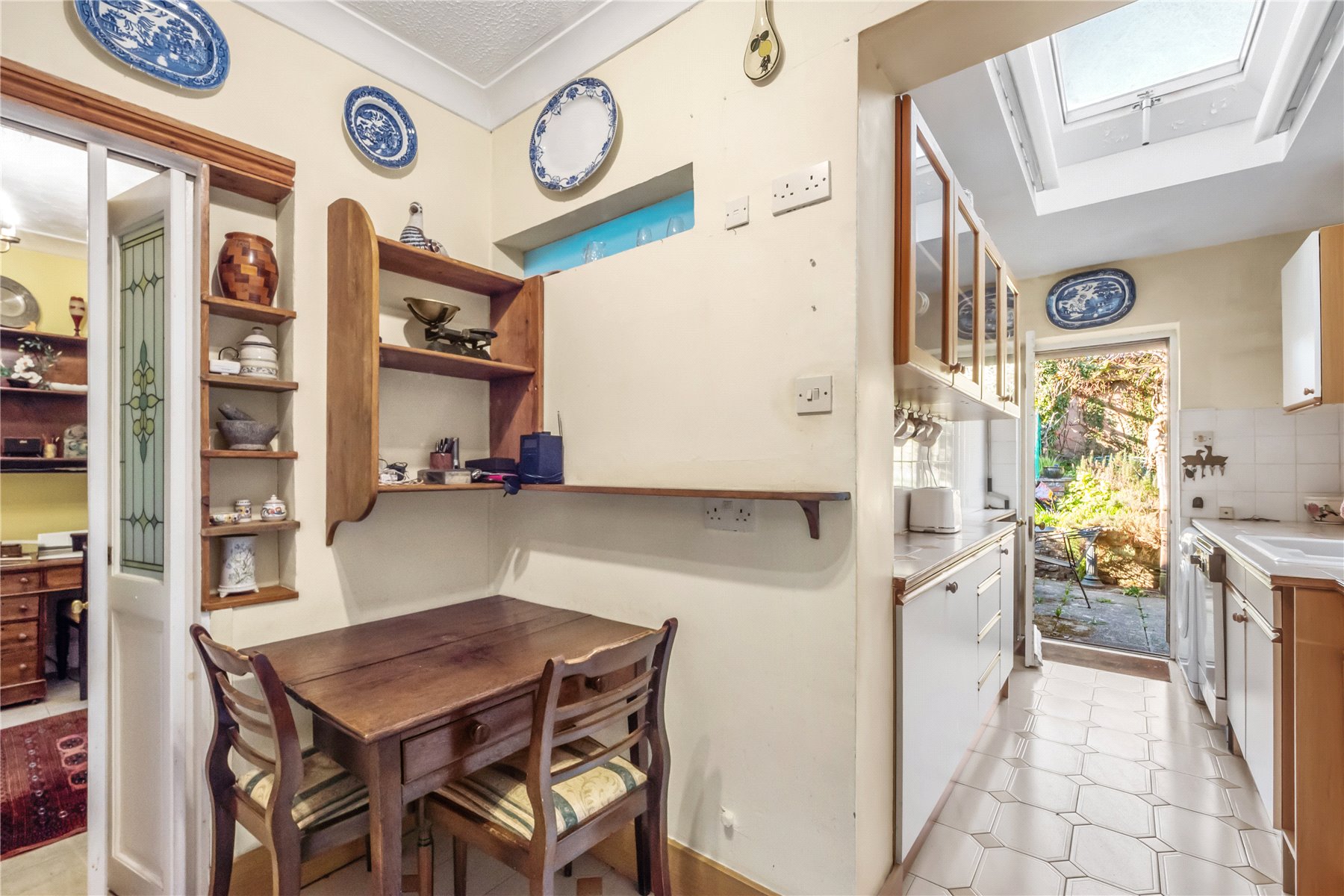 The generous SITTING ROOM, with its expansive study area, has plentiful light, courtesy of the twin tunnel lights and the patio doors that open onto a private walled rear garden.