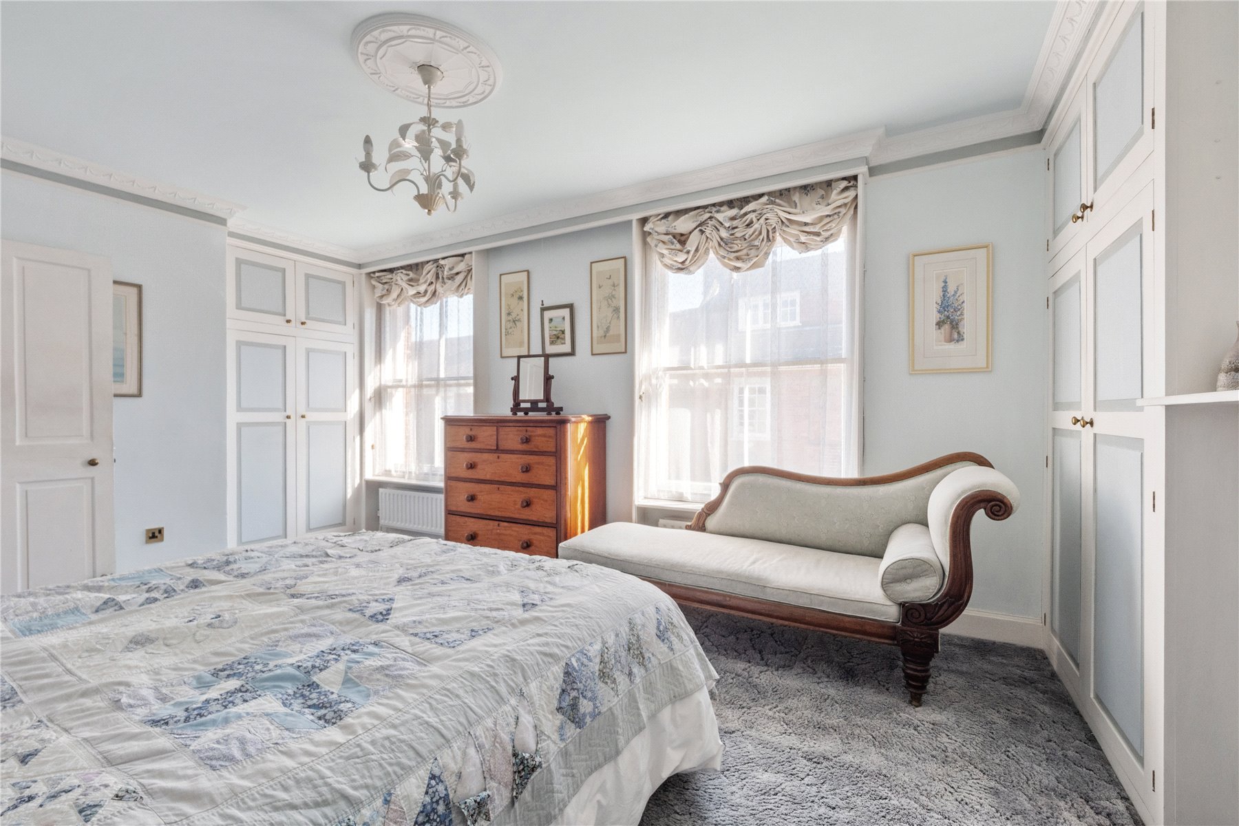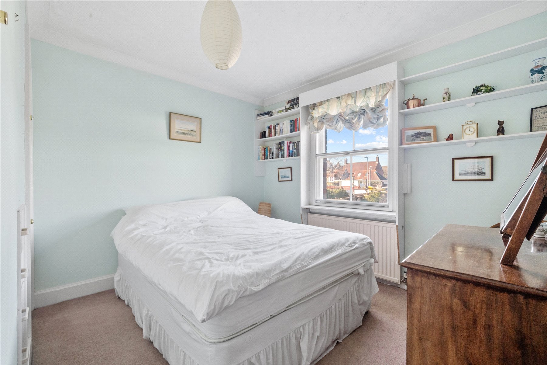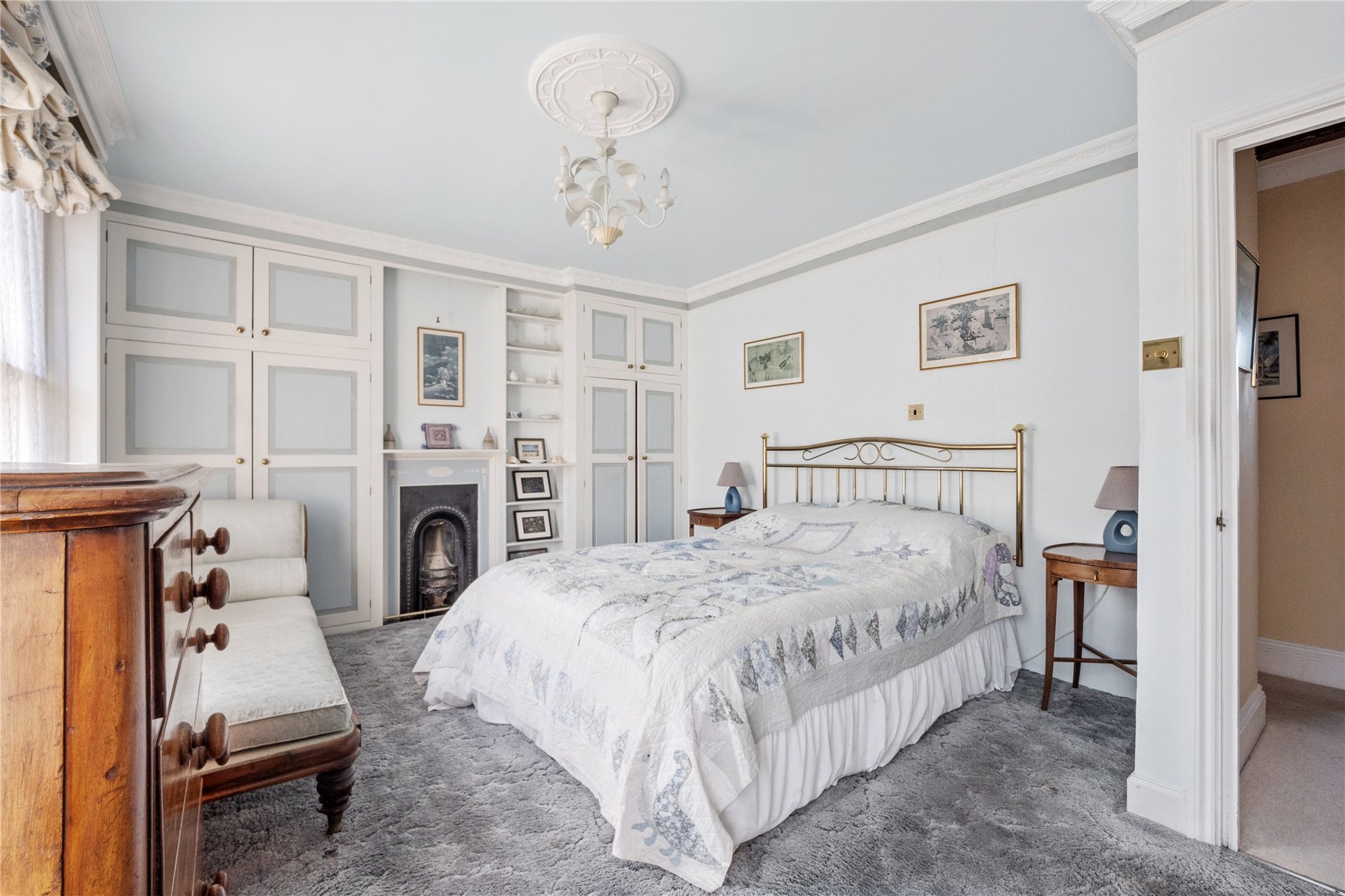 The PRINCIPAL BEDROOM, is an elegant double, and features twin sash windows overlooking East Street, flooding the room with light. An original fireplace, flanked by built-in wardrobes, provides ample storage.