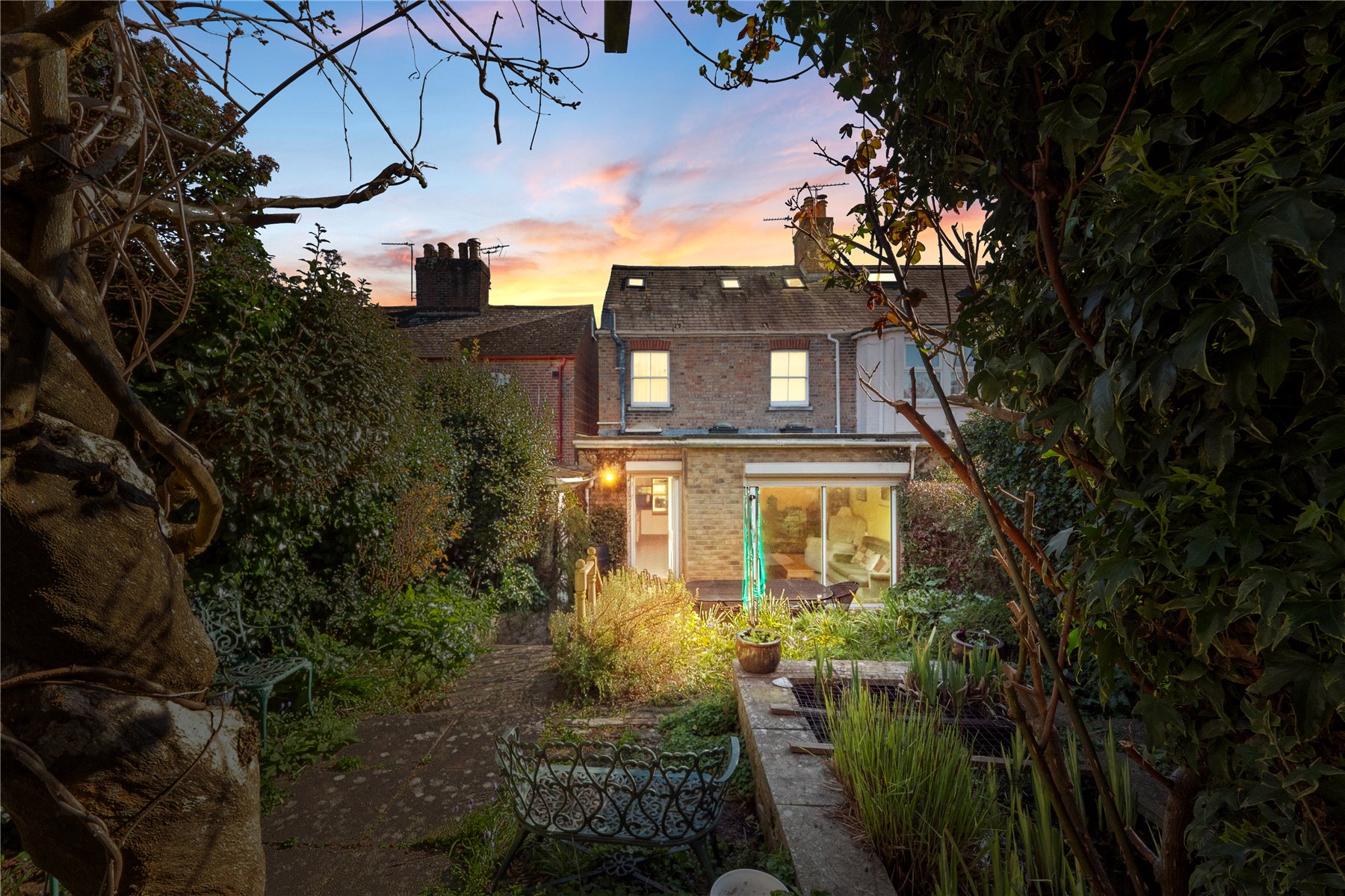 The pretty walled garden at the rear is a vibrant oasis, brimming with mature shrubs, trees, climbing roses, and cottage garden plants.
