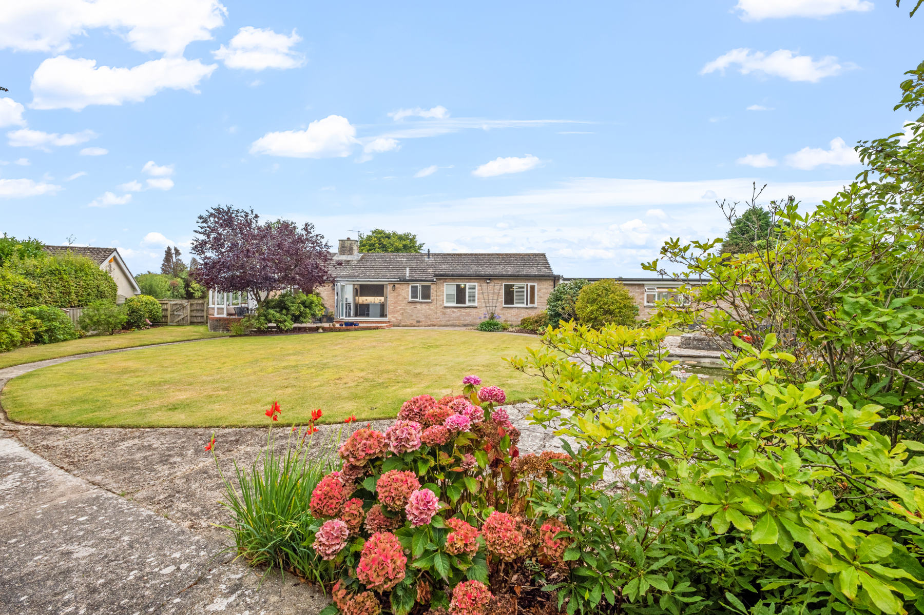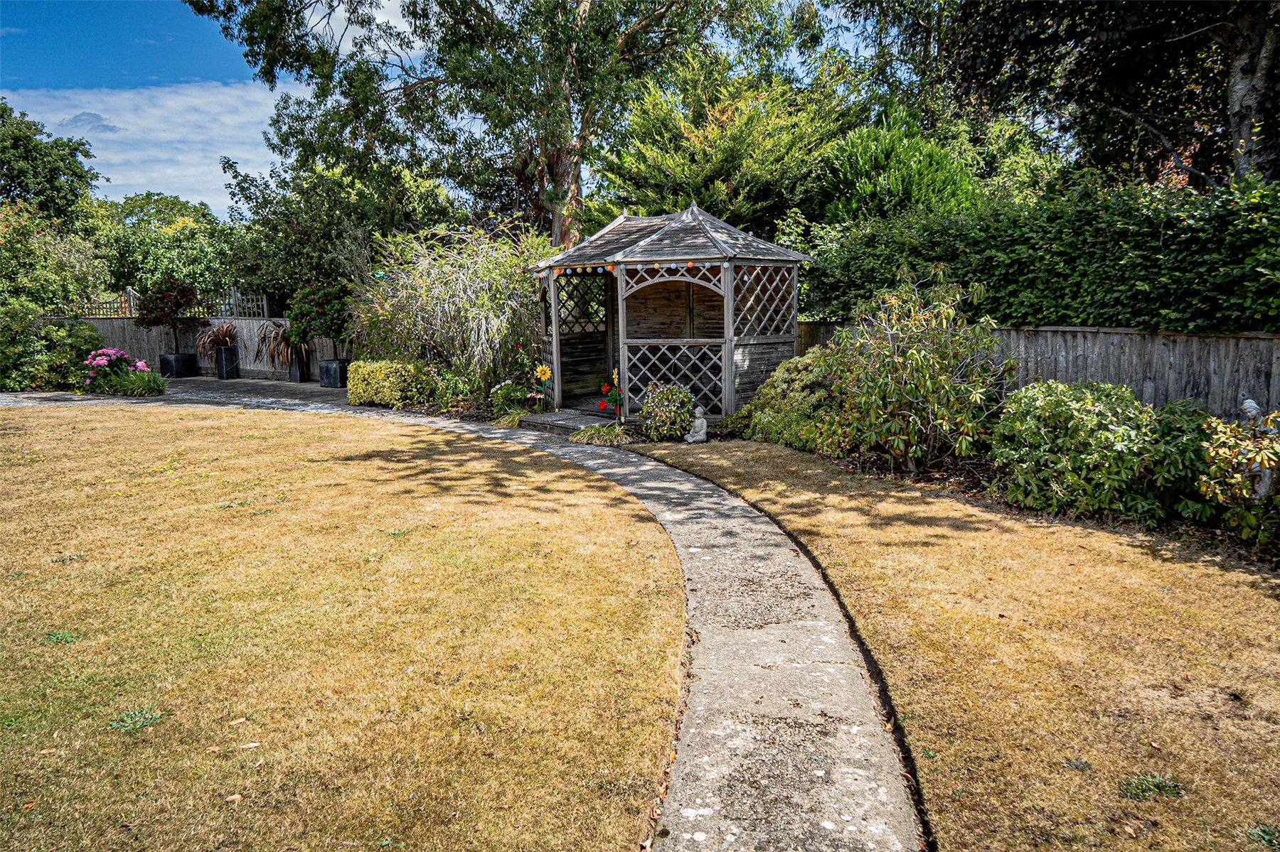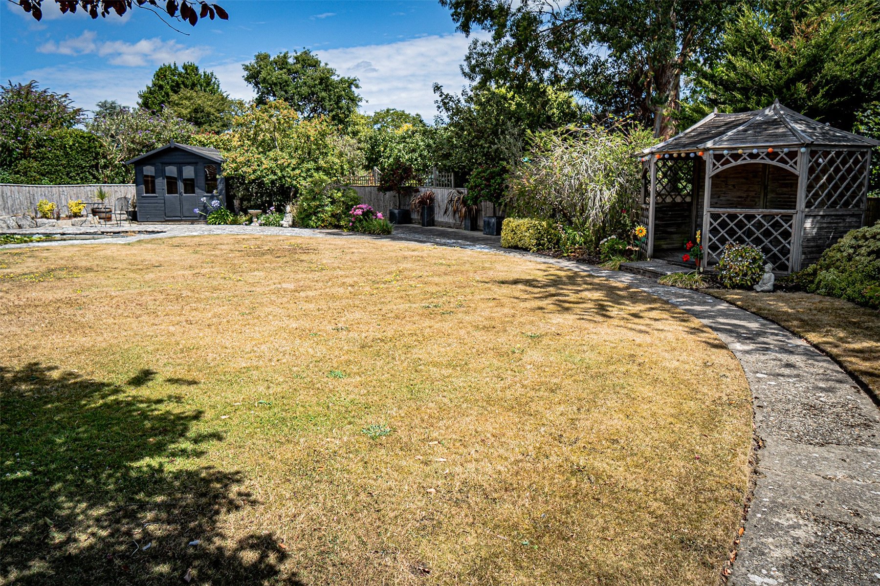 The private, sunny, rear GARDEN has pathways tempting you to different areas, one leading you to the rather secluded and pretty pond, with water lillies and a waterfall, overlooked by the SUMMERHOUSE. A covered GAZEBO is positioned to make the most of the evening sun, a perfect place to end the day with a glass of something chilled. There is so much fragrance, colour and texture in the garden, something to catch the eye and simply enjoy all year round. There is an entertaining patio area for a table and chairs, with the bi-fold doors from the kitchen opening up to allow guests to enjoy the garden from inside or out.