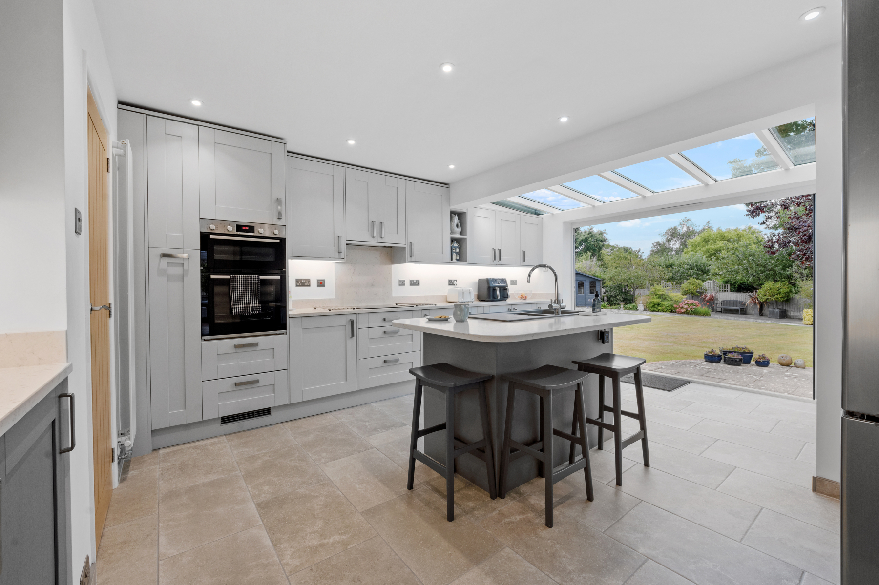 The new, contemporary KITCHEN draws you in with the lure of the garden beyond taking your eye through. The part glazed roof and bifold doors open onto the large patio, perfect for entertaining friends and family and spending quality time together. There is plenty of storage space and work surfaces too, with a breakfast bar for casual chats with friends. The UTILITY AREA is a handy space for laundry and storage with plumbing for washing machine and dryer.