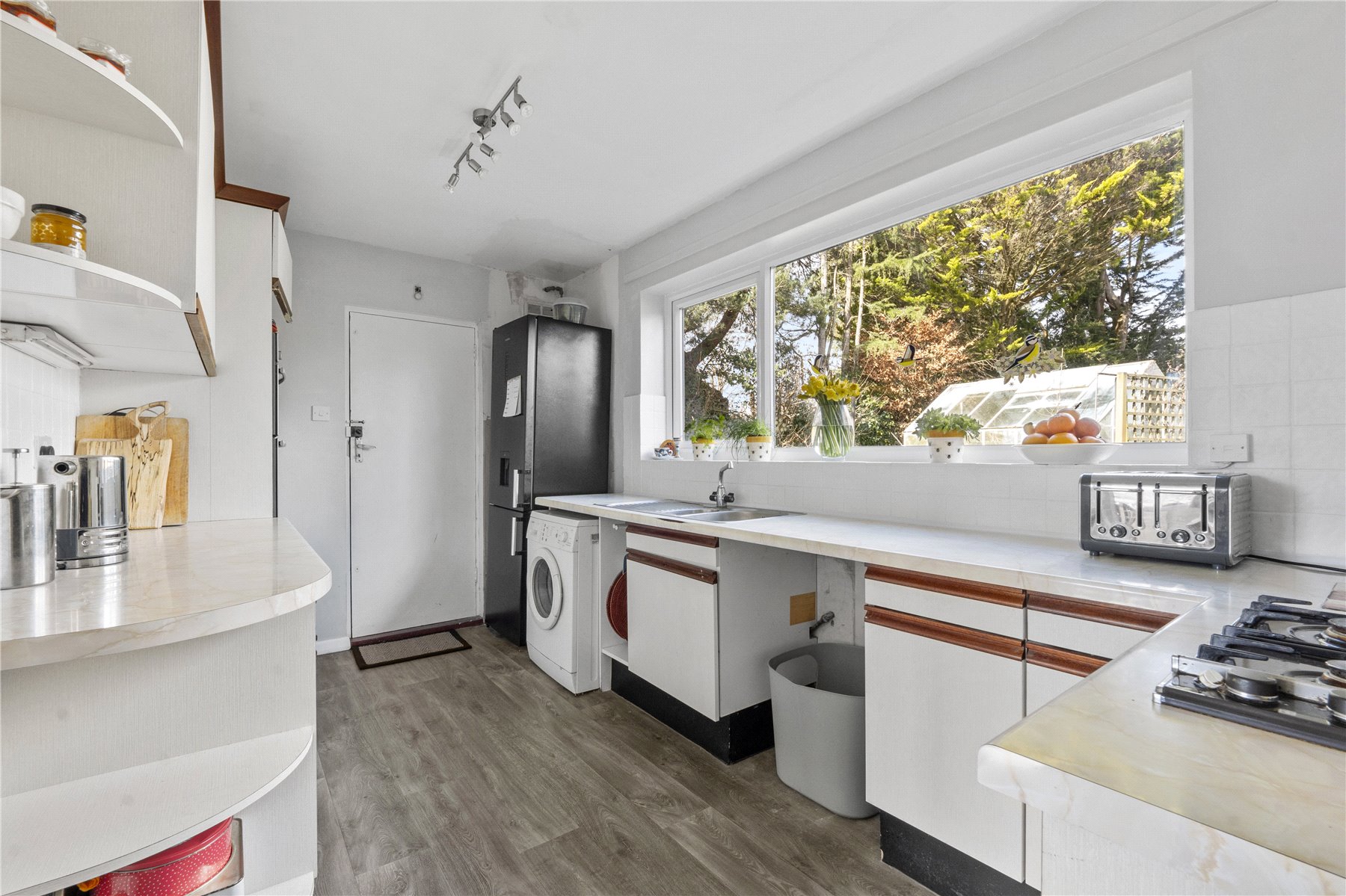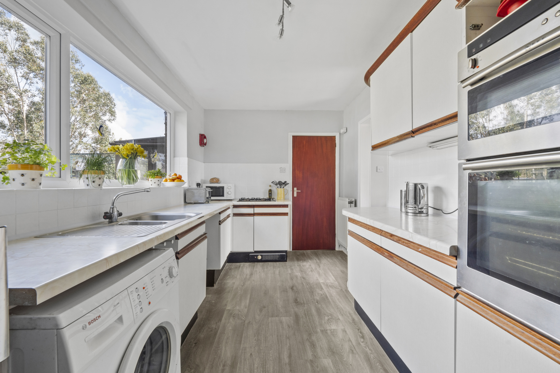 The KITCHEN looks out to the rear garden, with wide windows allowing plenty of natural light into this working space. It is functionary, if dated by modern standards. However, the SCULLERY is definitely a desired addition, housing the boiler and further storage. Another door leads to the integral garage and a further door leads out to the rear garden.