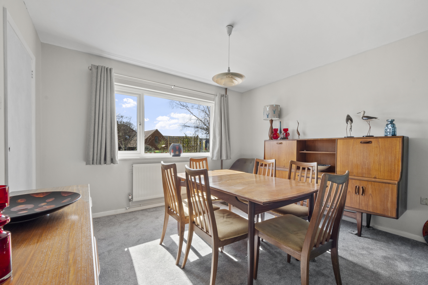 The DINING ROOM also has a wide window overlooking the garden to the front. It is a generous space with room for a large dining set and doors through to the kitchen.