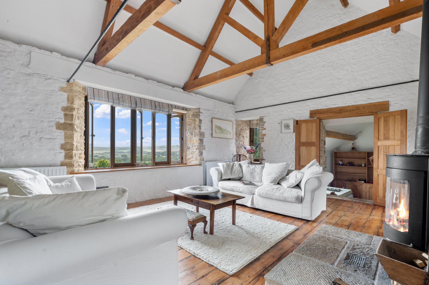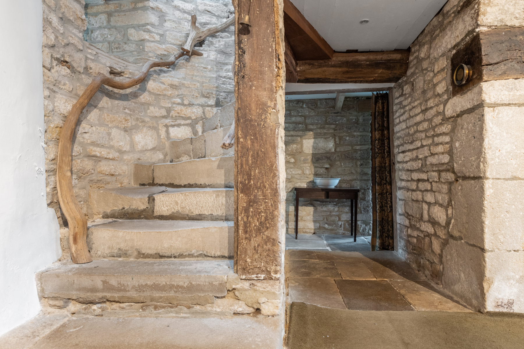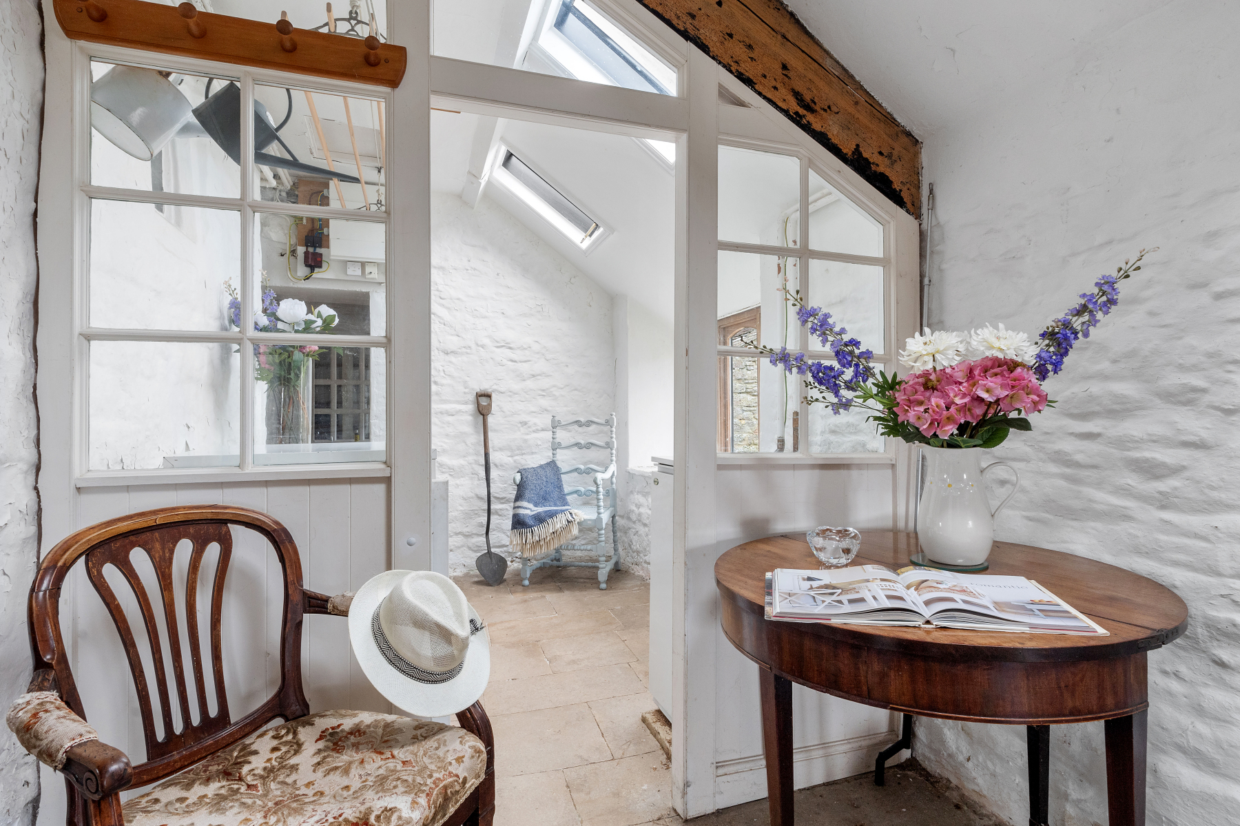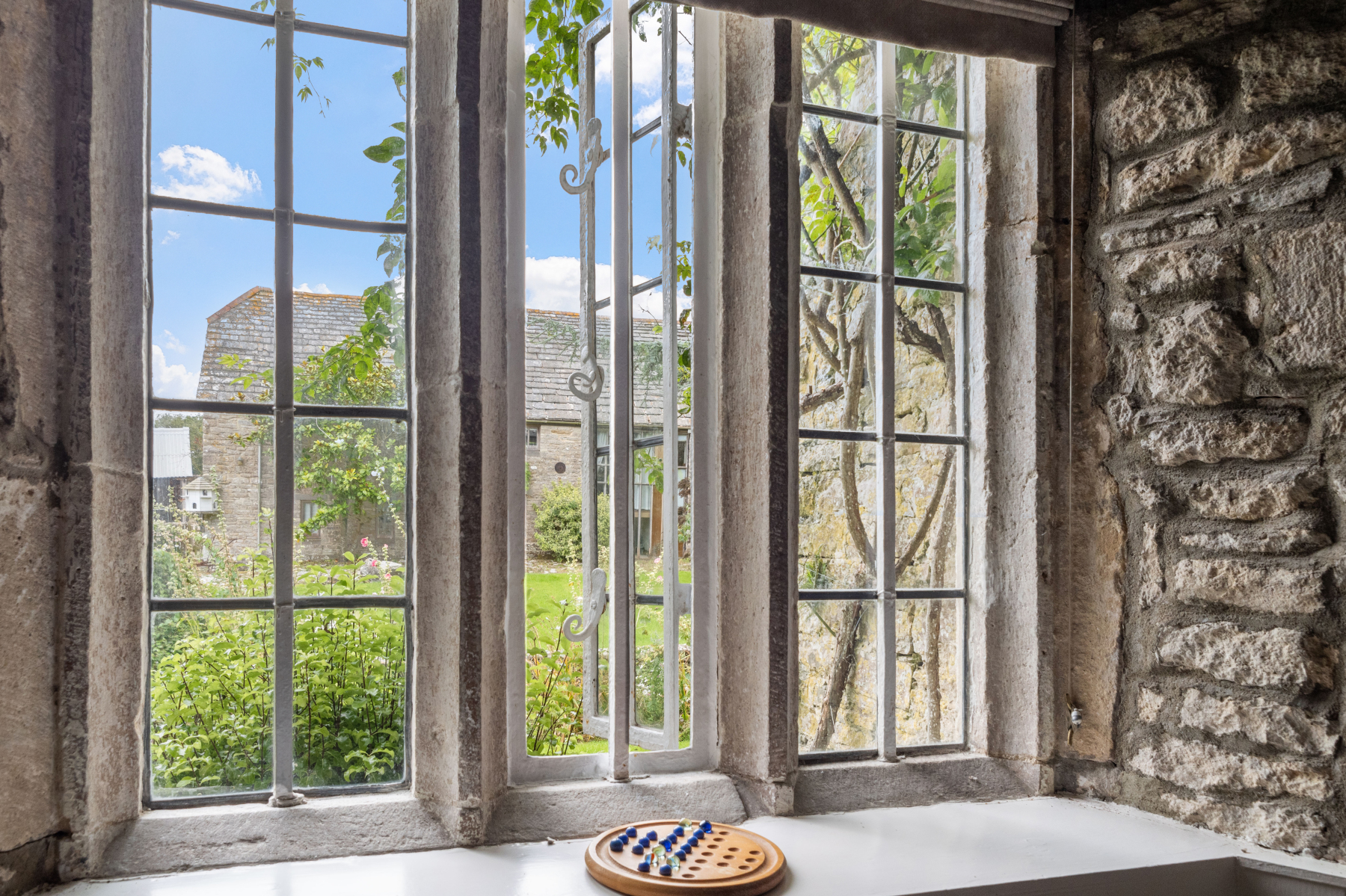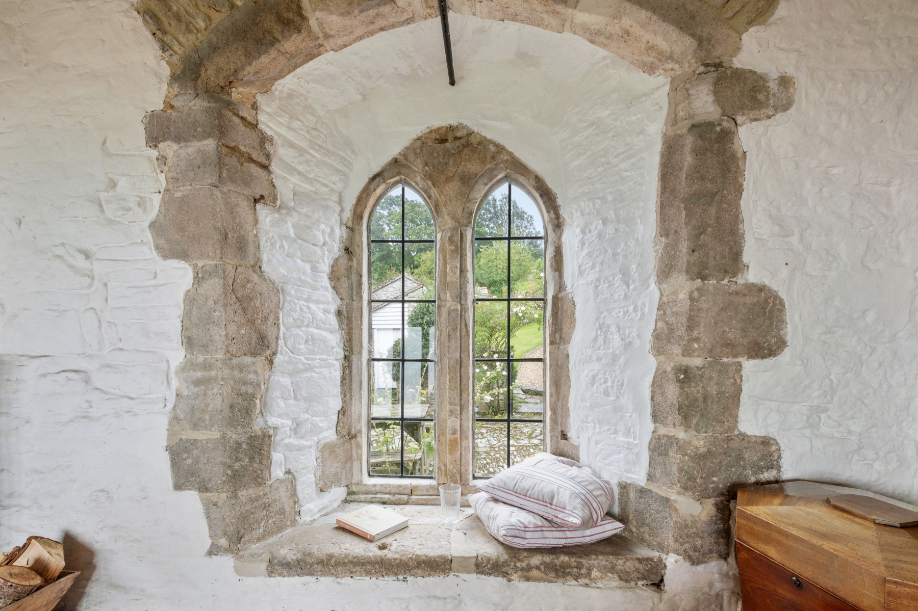 At the other end of the inner hall, artisan steps lead to THE CHAPEL a vaulted-ceiling room with a timber floor over medieval cobbles, an ancient window, and exposed stone. A large window here perfectly frames Corfe Castle. A log-burner makes this light-filled space the principal sitting room.