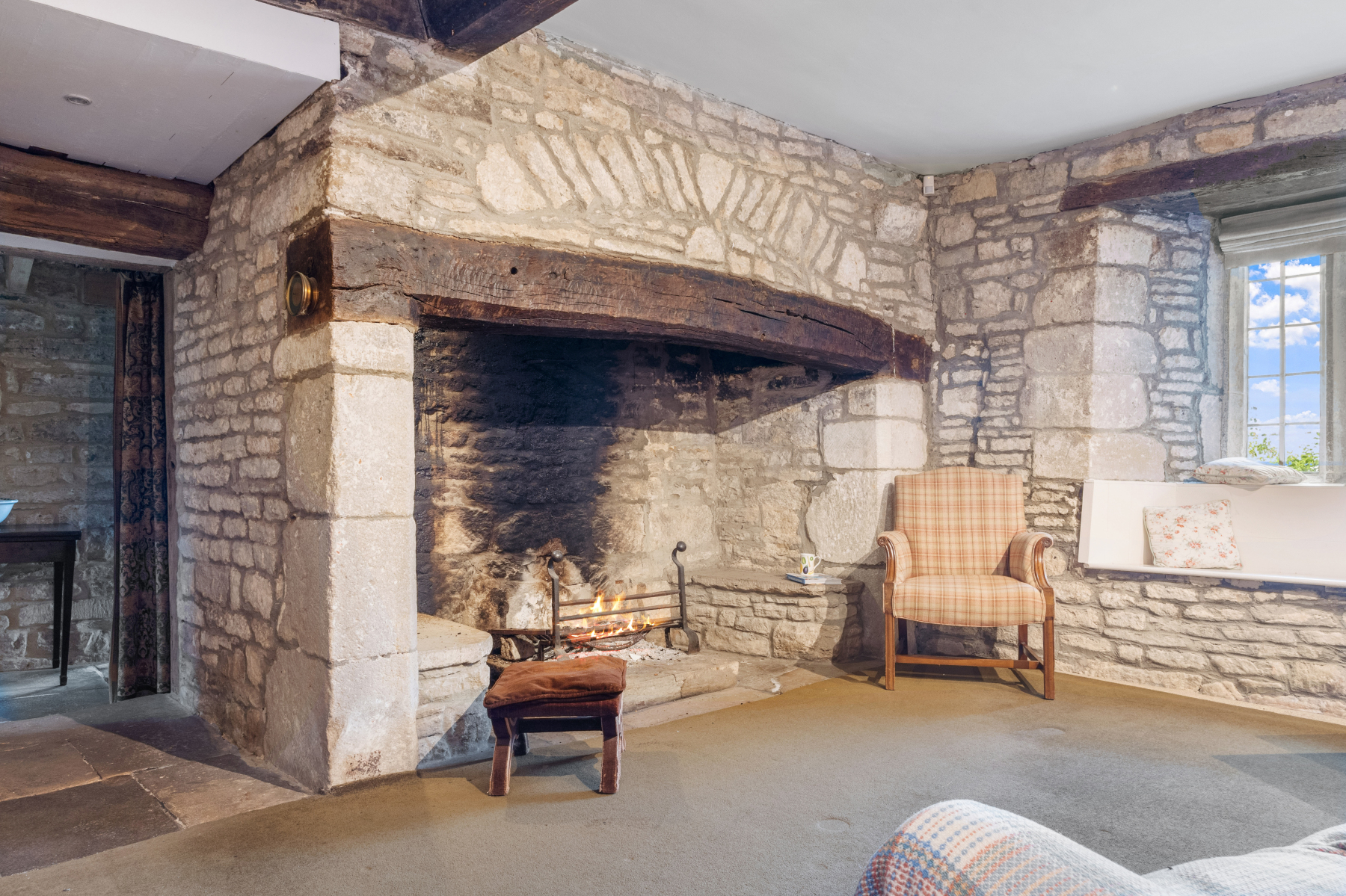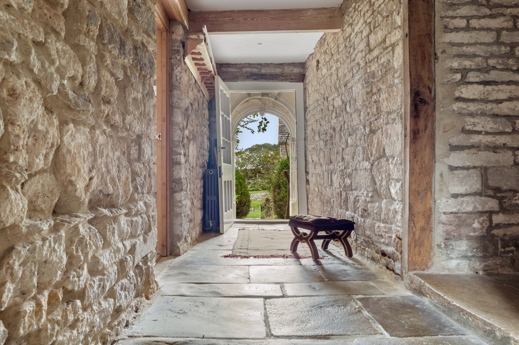The imposing stone doorway opens to a hallway with a flagstone floor and exposed Purbeck stone walls. To the right is the DINING ROOM, with a walk-in inglenook fireplace, windows facing West, East, and North, and ample space for grand dinners. To the left is THE SNUG, featuring another ancient inglenook, a curved staircase to the first floor, and an internal window into the inner hallway.