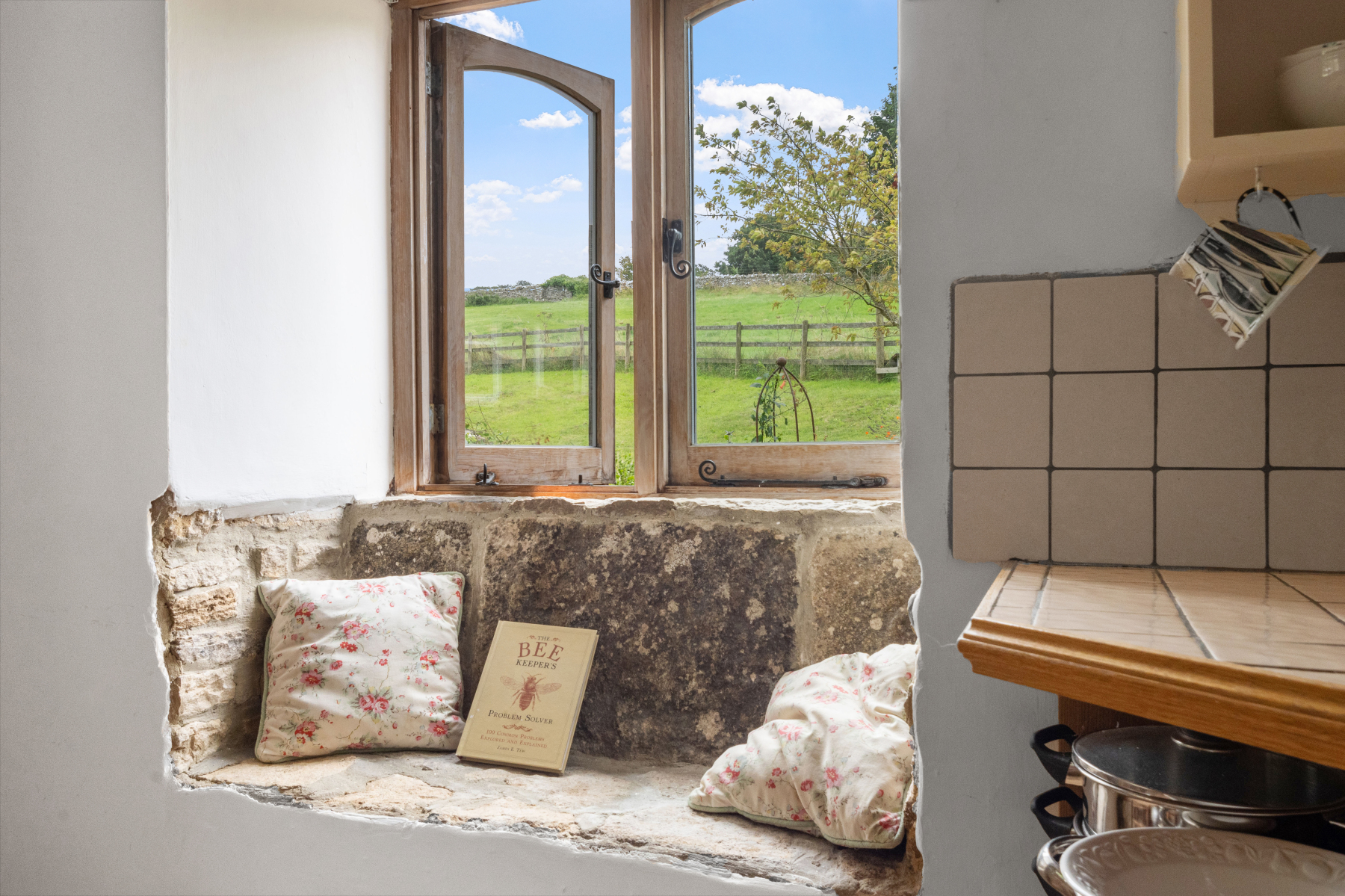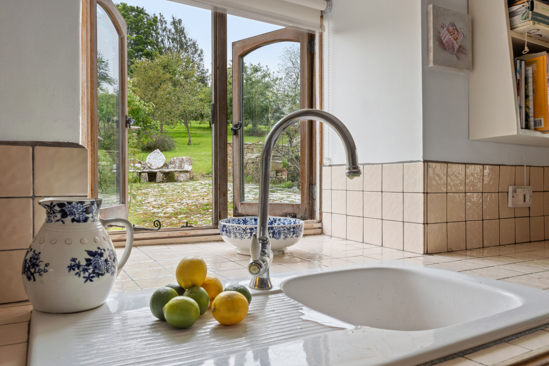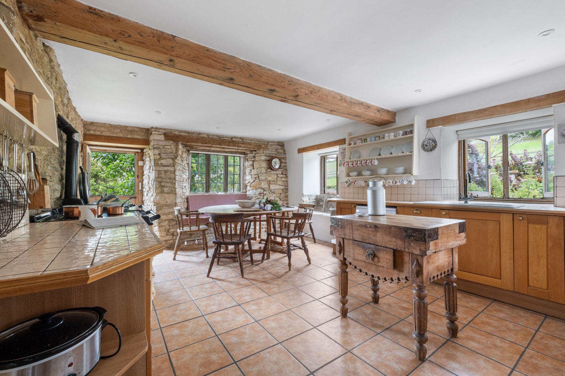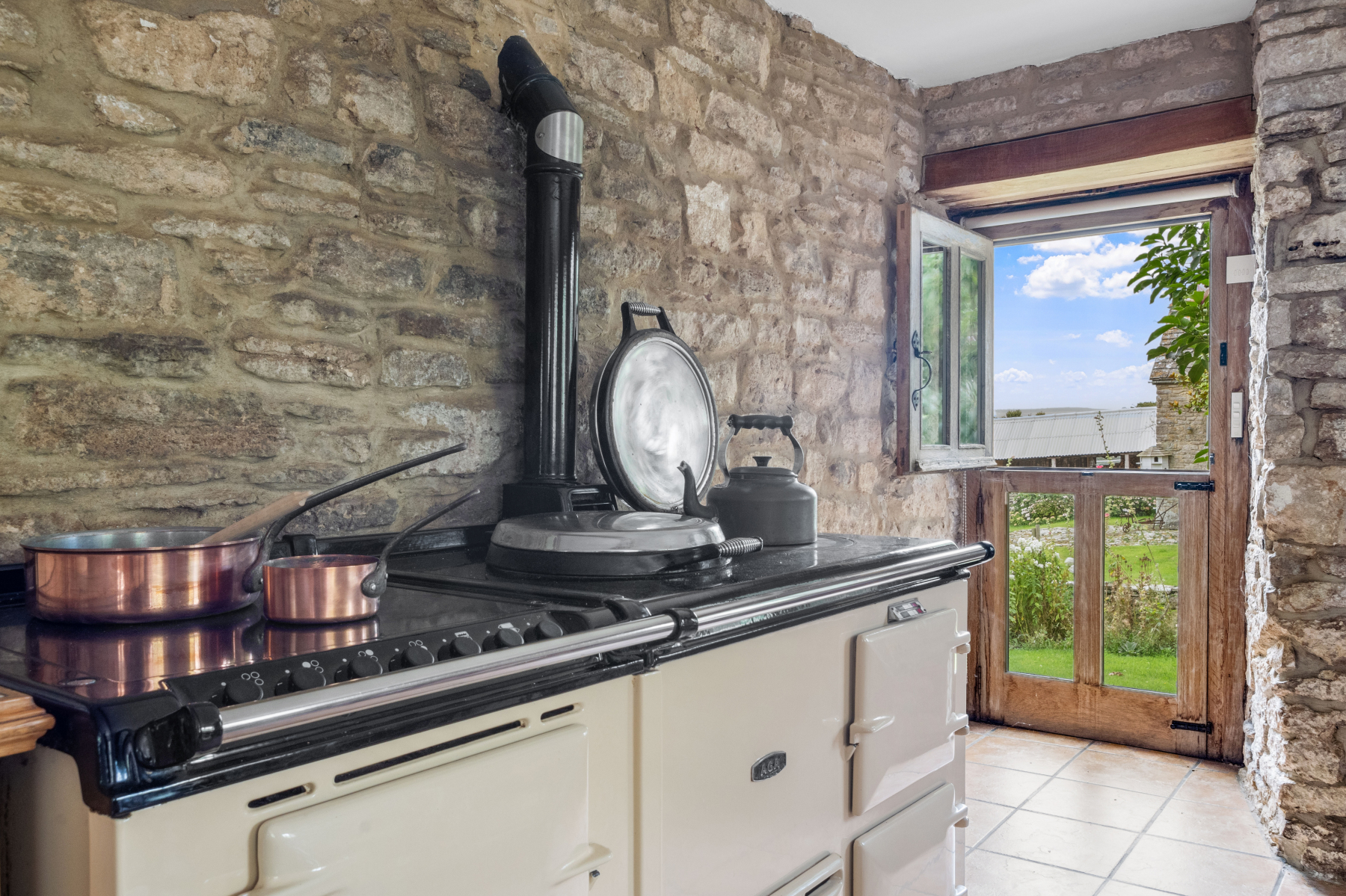 A door leads into the KITCHEN, centred around a traditional Aga and framed by exposed stone and beams. Windows look out to the gardens, duck pond, and paddocks, with a stable door to the flower-filled front garden. A door leads to a UTILITY area with a walk-in PANTRY and a sink, ideal for preparing flowers and veg. A separate W.C. is next door.