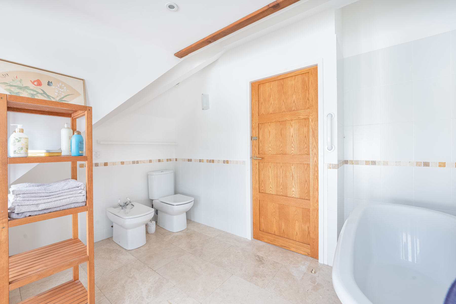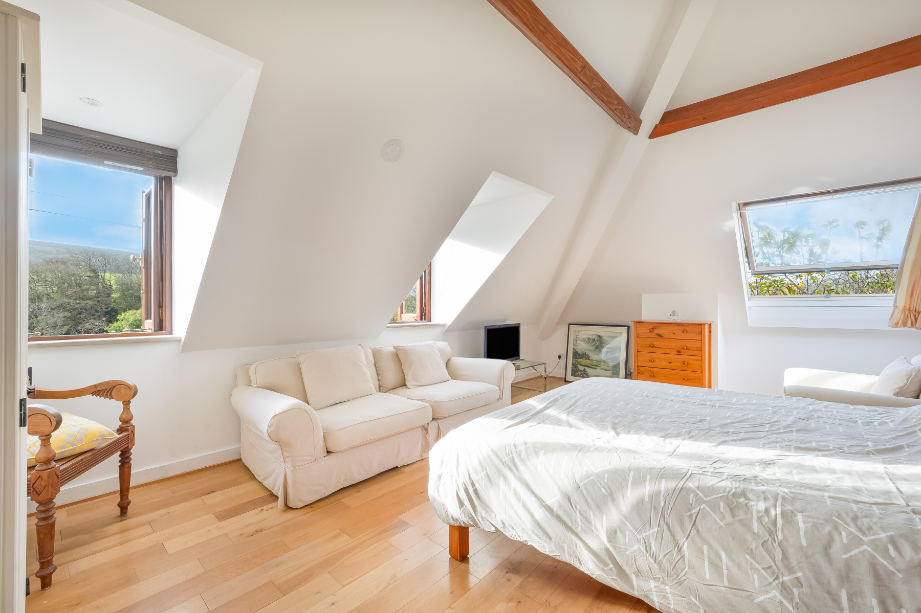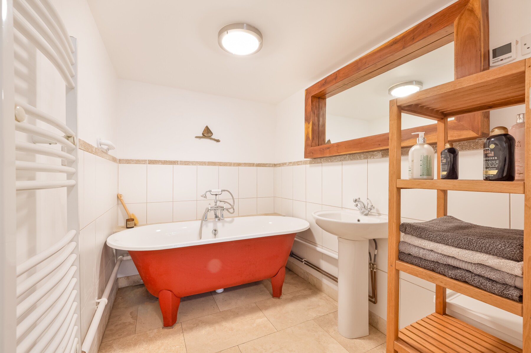 On entering through the front door, the bright and fresh HALLWAY welcomes you in with the alure of what lays beyond. The ground floor BATHROOM is off the hall and has a claw foot bath and wash basin with ample space for storage too. Through a clever cupboard, there is direct access to a DOUBLE GARAGE, offering practicality alongside style, and space for a workshop.