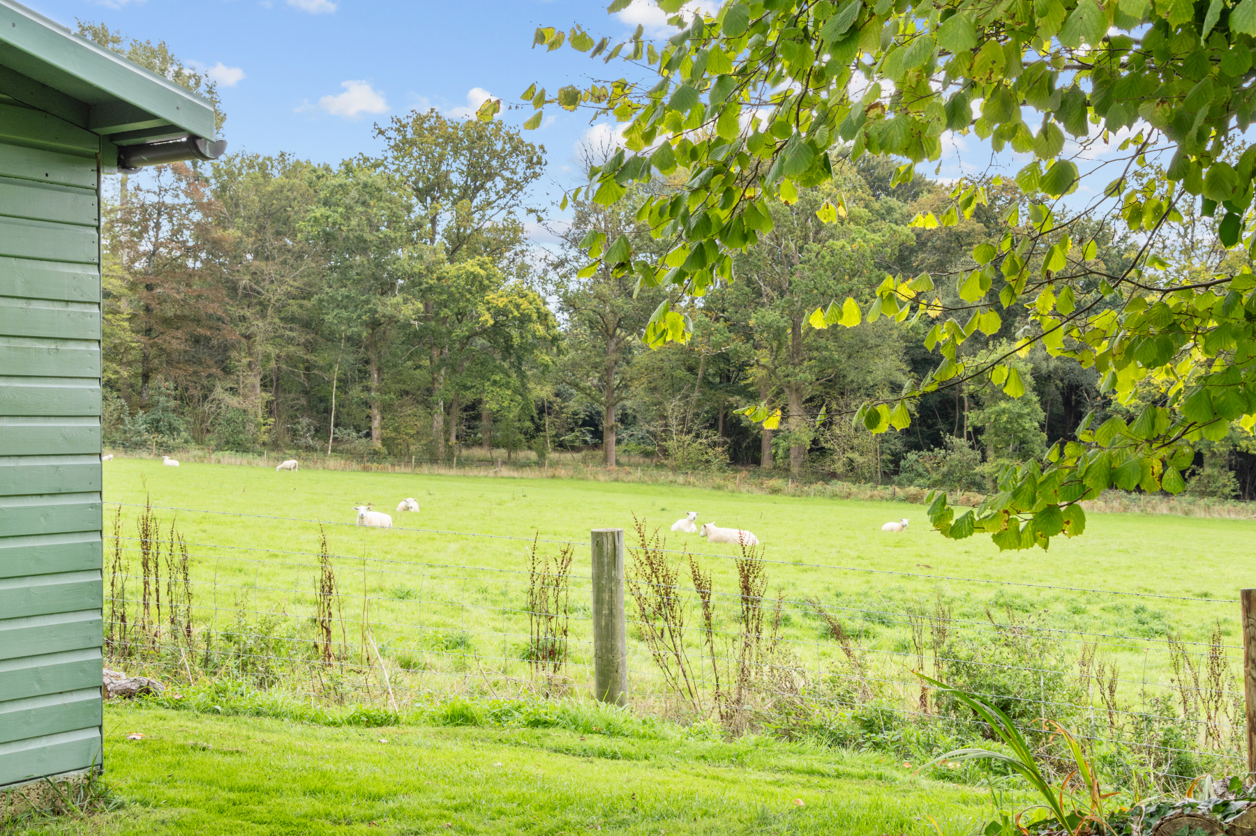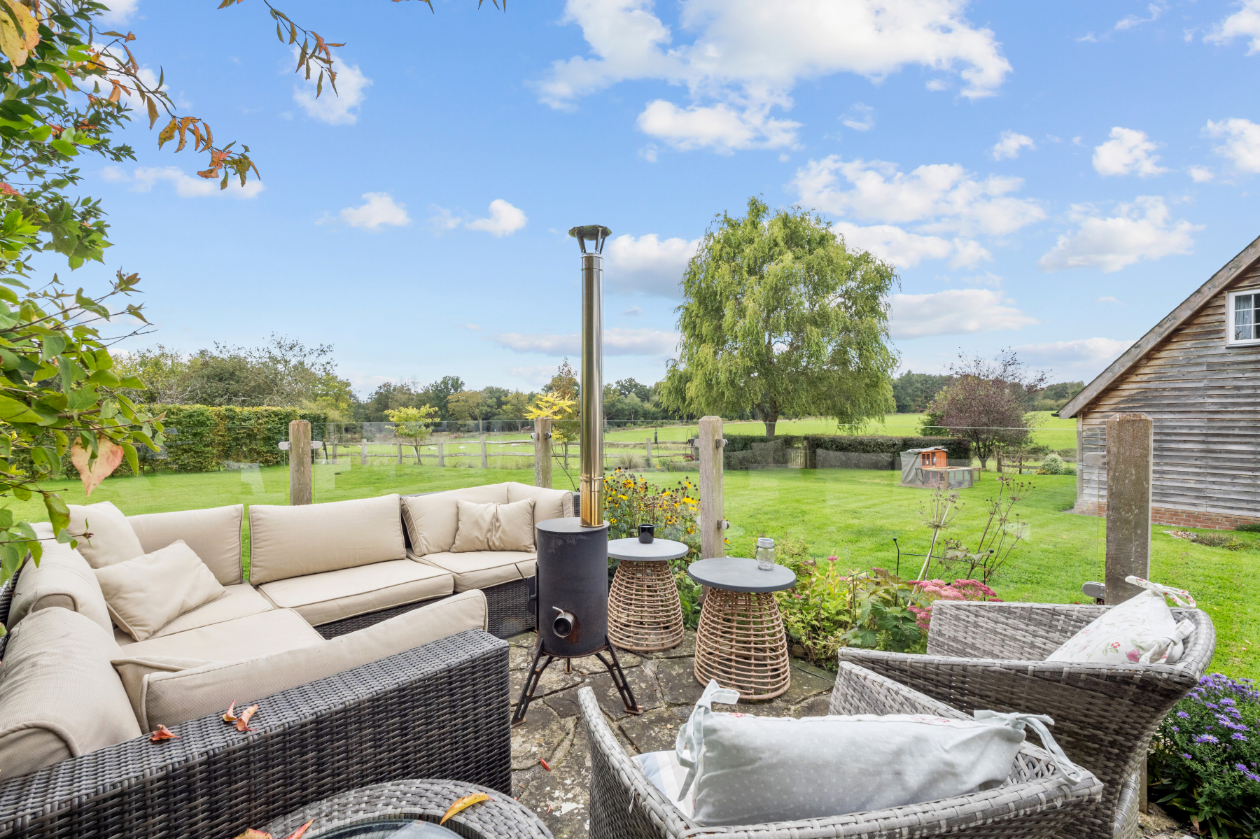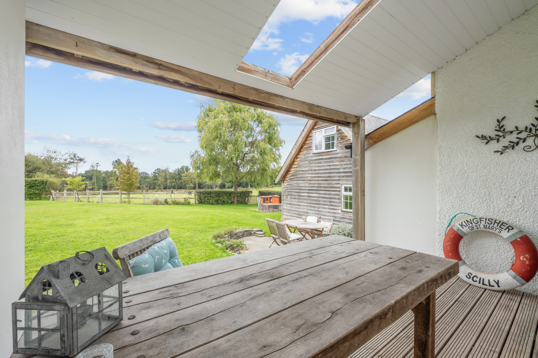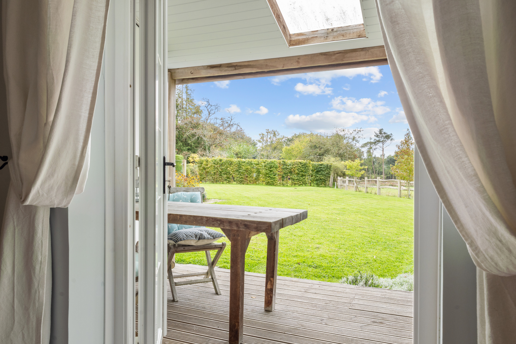 A few further steps though the garden and behind a cleverly planted hedge, there is the ‘SECRET ORCHARD’. Here it is also laid to lawn, but with more of a rustic feel. There are apple trees that are heavily laden in the autumn time. There are a couple of sheds which are handy to stow away chairs and garden paraphernalia. Here, there is a viewpoint out towards open countryside.
