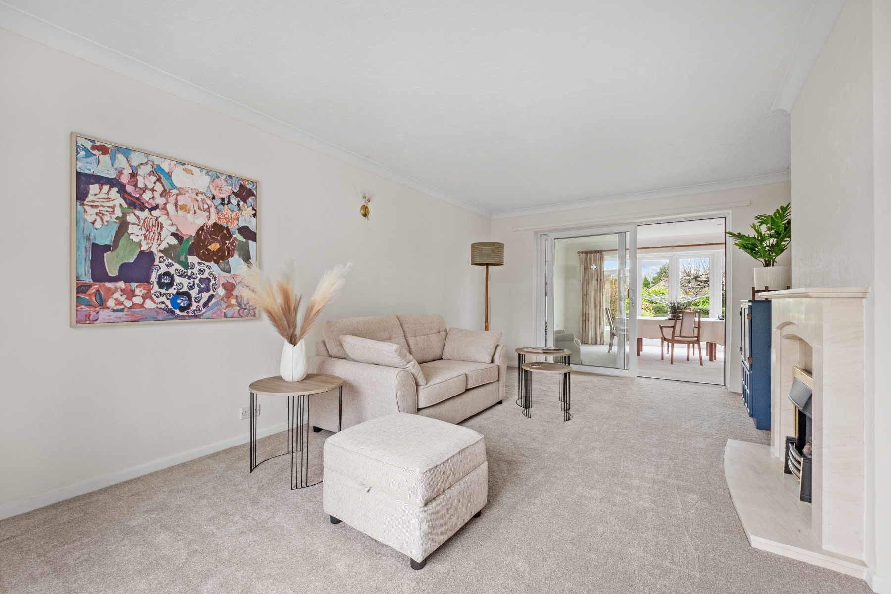 Positioned at the front of the home, the SITTING ROOM enjoys a pleasant outlook over the front garden through a large window that allows natural light to pour in. The room is centred around a fireplace with inset gas fire, creating a natural focal point and a cosy setting during the cooler months. A sliding door connects seamlessly to the DINING ROOM, allowing the two spaces to flow together while still allowing the option to separate the spaces if desired.