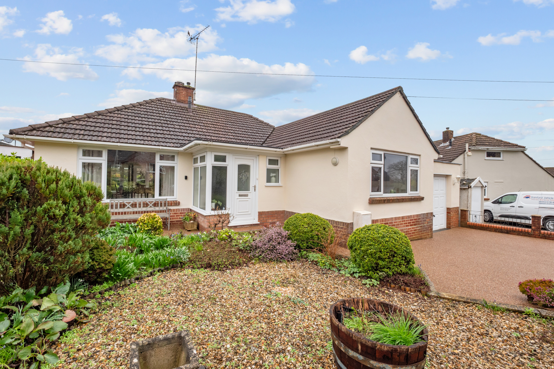 To the front, the garden is thoughtfully arranged with established planting, mature shrubs and a gravelled area, creating an attractive approach while providing a natural degree of screening from the road. The overall frontage enhances the kerb appeal and presents the home well from first glance.