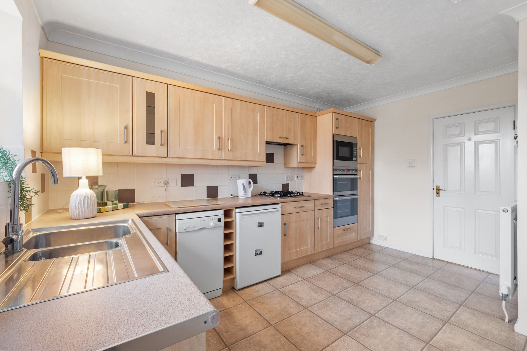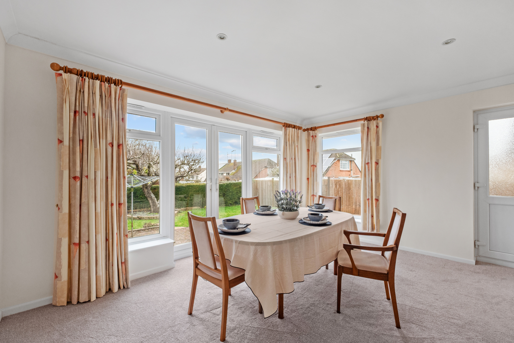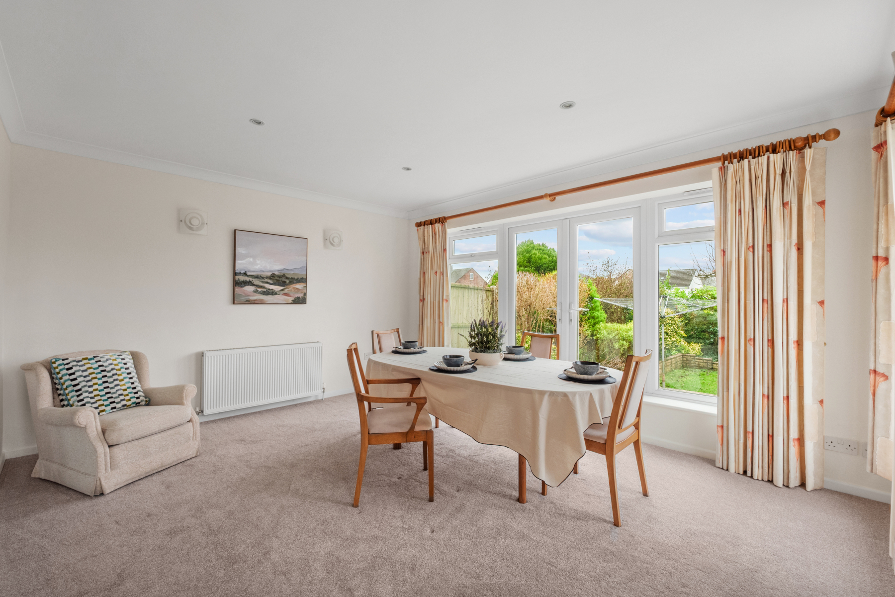 The DINING ROOM is generously proportioned and comfortably accommodates a family-sized dining table with additional furniture. Multiple windows ensure the space feels bright throughout the day, while both double and single doors open directly onto the rear garden. This connection to the outside enhances the overall sense of space and makes the room particularly well suited to hosting family gatherings or summer occasions.