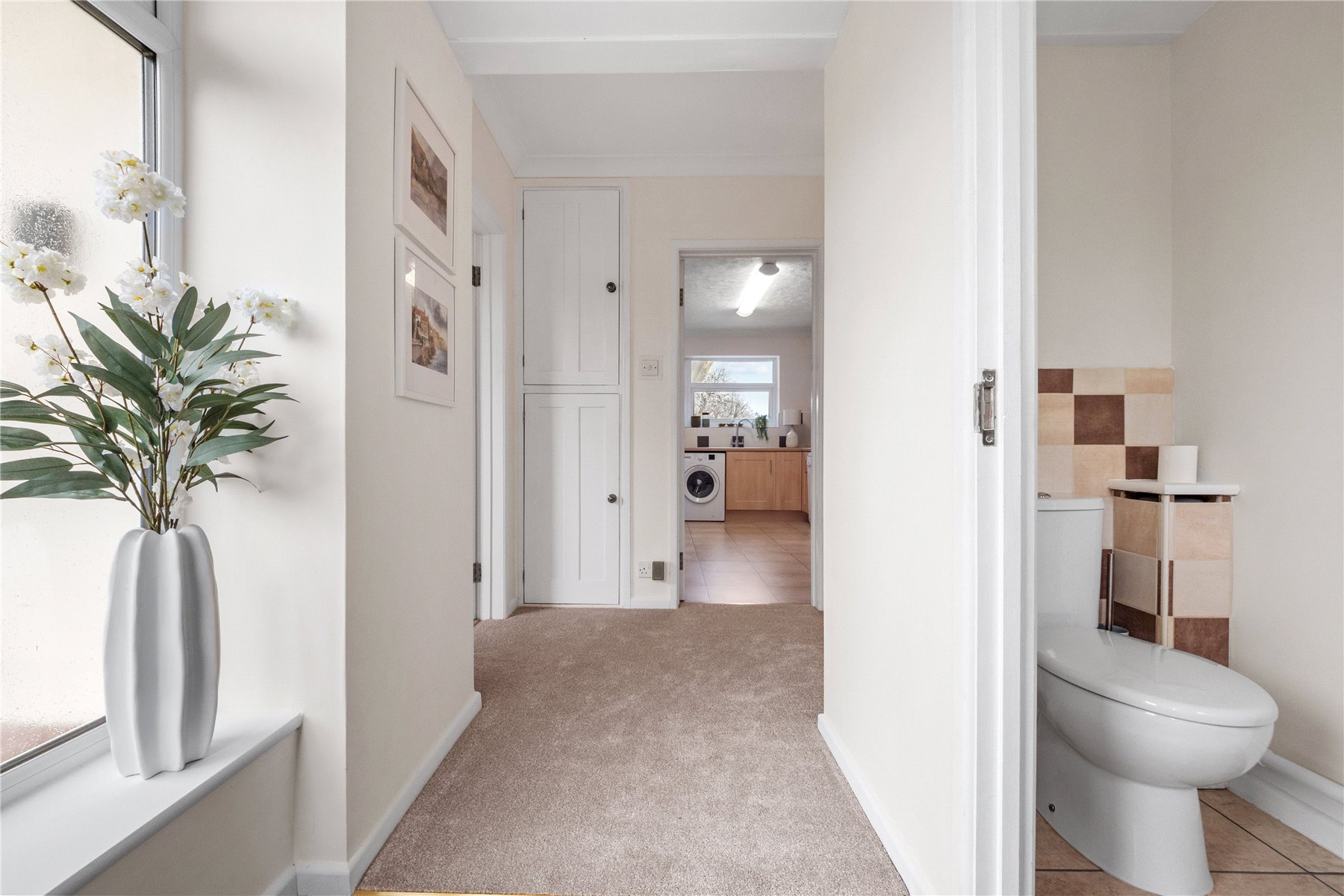 The property is entered via a welcoming ENTRANCE HALL which provides access to the principal rooms and immediately conveys the sense of light and balance found throughout the home. Discreetly positioned adjacent to the front door is a CLOAKROOM fitted with a wash hand basin and W.C., offering useful convenience for residents and visitors alike.