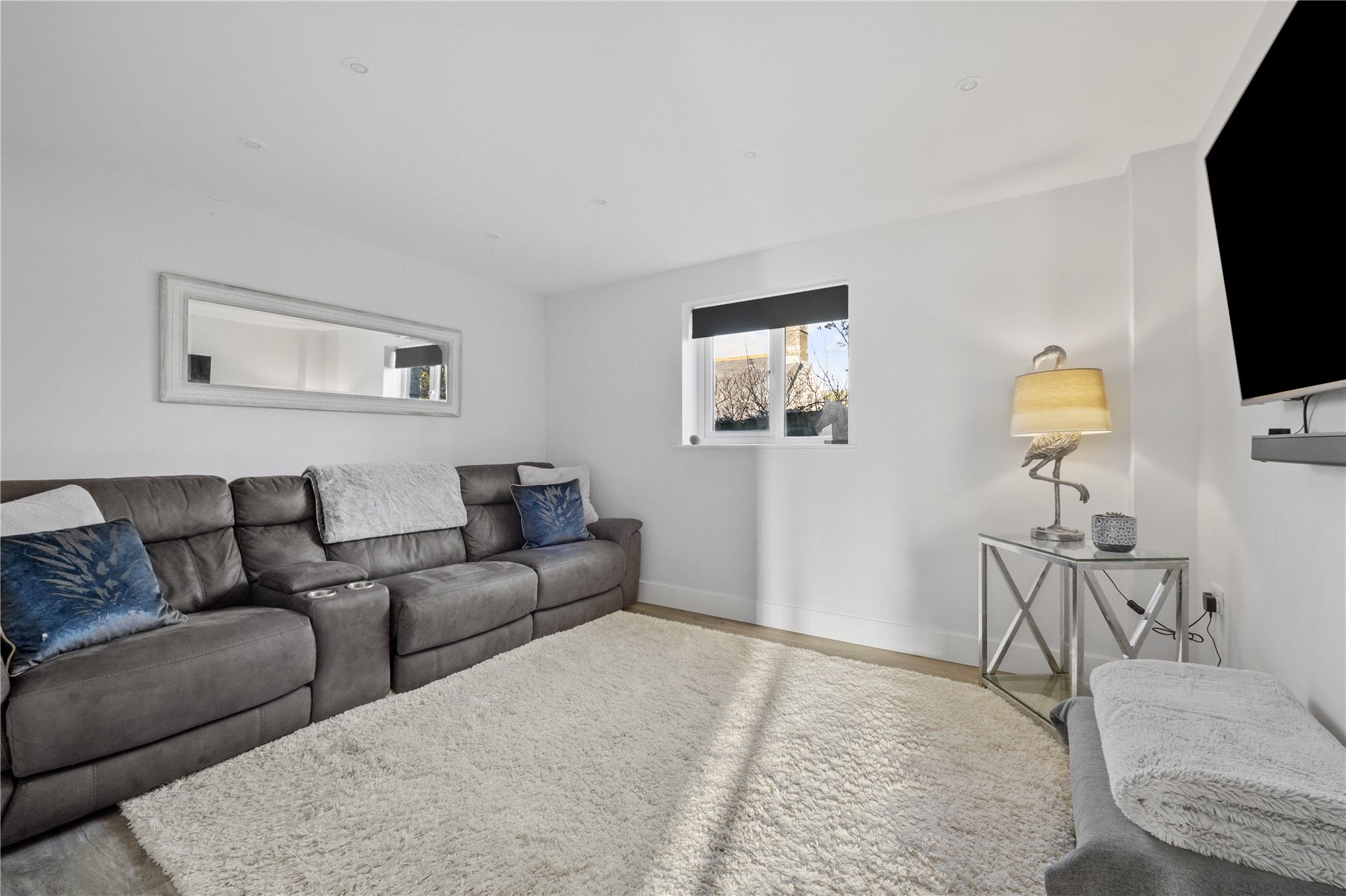 Karndean flooring runs throughout the property, except in the kitchen/dining area where stylish ceramic tiles have been laid. The generous ENTRANCE HALL features a staircase with a glass balustrade and a skylight, creating an immediate sense of space and light.