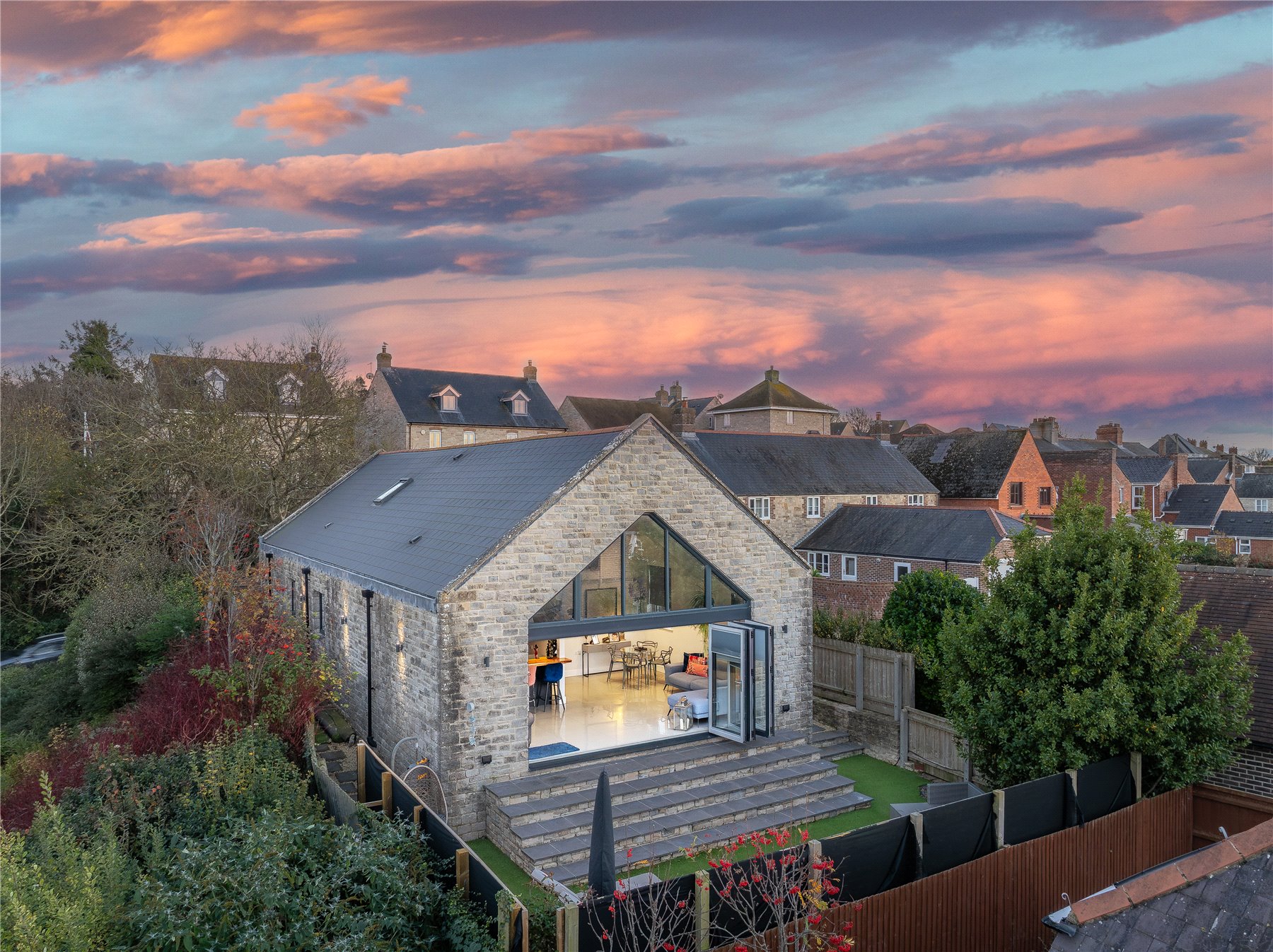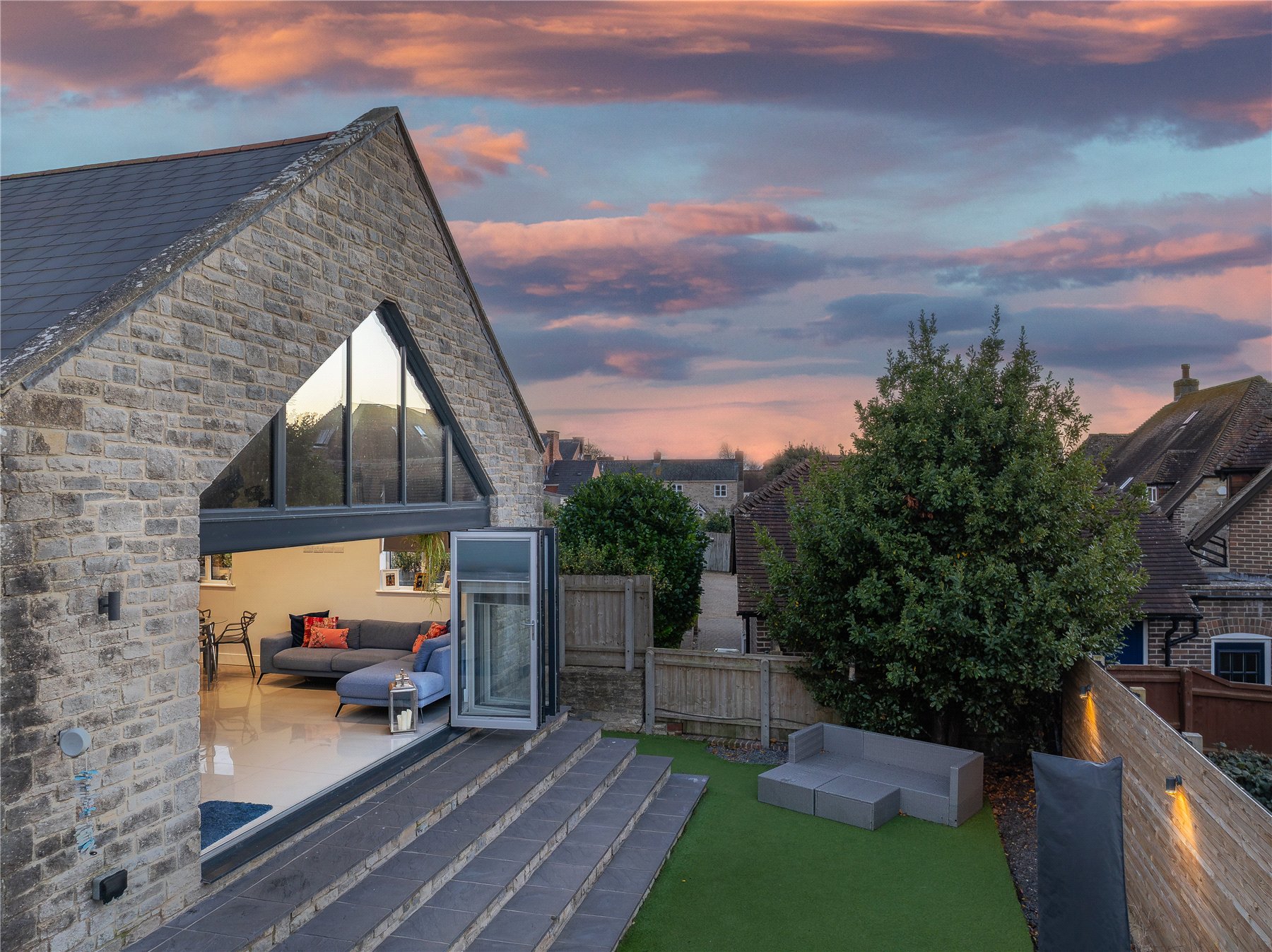 Originally constructed in the 1930s as an Evangelical chapel, this detached stone-built property later served as the village hall before being converted by the current owners into a stunning contemporary home. The building has been completely renovated throughout and thoughtfully reimagined by an architect, seamlessly blending historic character with modern design. The result is a beautifully presented residence featuring wonderfully high ceilings and expansive windows that flood the interior with natural light.