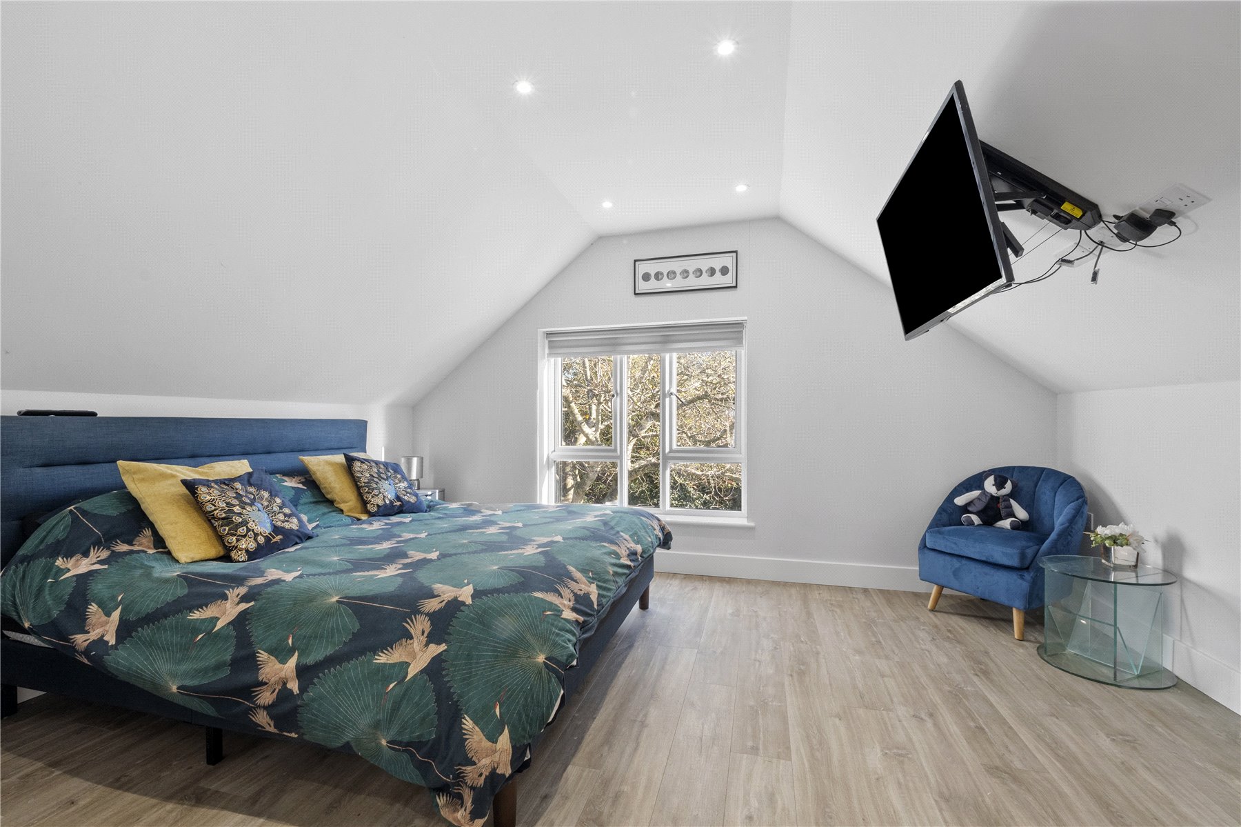 The first floor is accessed via a galleried landing with a Velux window, leading to the stylish PRINCIPAL BEDROOM which features two walk-in wardrobes and a generous BATHROOM with shower cubicle, bath, vanity basin, and WC. THE GALLERIED ROOM overlooks the kitchen/dining area below, offering a striking architectural feature. This versatile space provides ample eaves storage and is currently used as a study or home office.