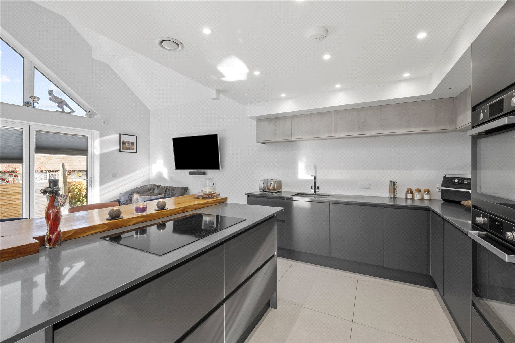 The fabulous galleried KITCHEN/DINING/SITTING ROOM is a wonderfully light and impressive space with high ceilings and 5-metre bi-fold doors topped by a large triangular window framing the view. The kitchen is beautifully designed and fitted with a range of contemporary base and wall units with quartz worktops, a Zanussi induction hob, integrated full-height refrigerator, under-counter freezer, integrated double oven, dishwasher, and a granite sink. There is also a pull-out, full-height larder unit and a hand-crafted red cedar wood breakfast bar with storage cupboards beneath. The open-plan layout provides ample space for a sofa and a large dining table, making it ideal for entertaining and family life, the real heart of the home.