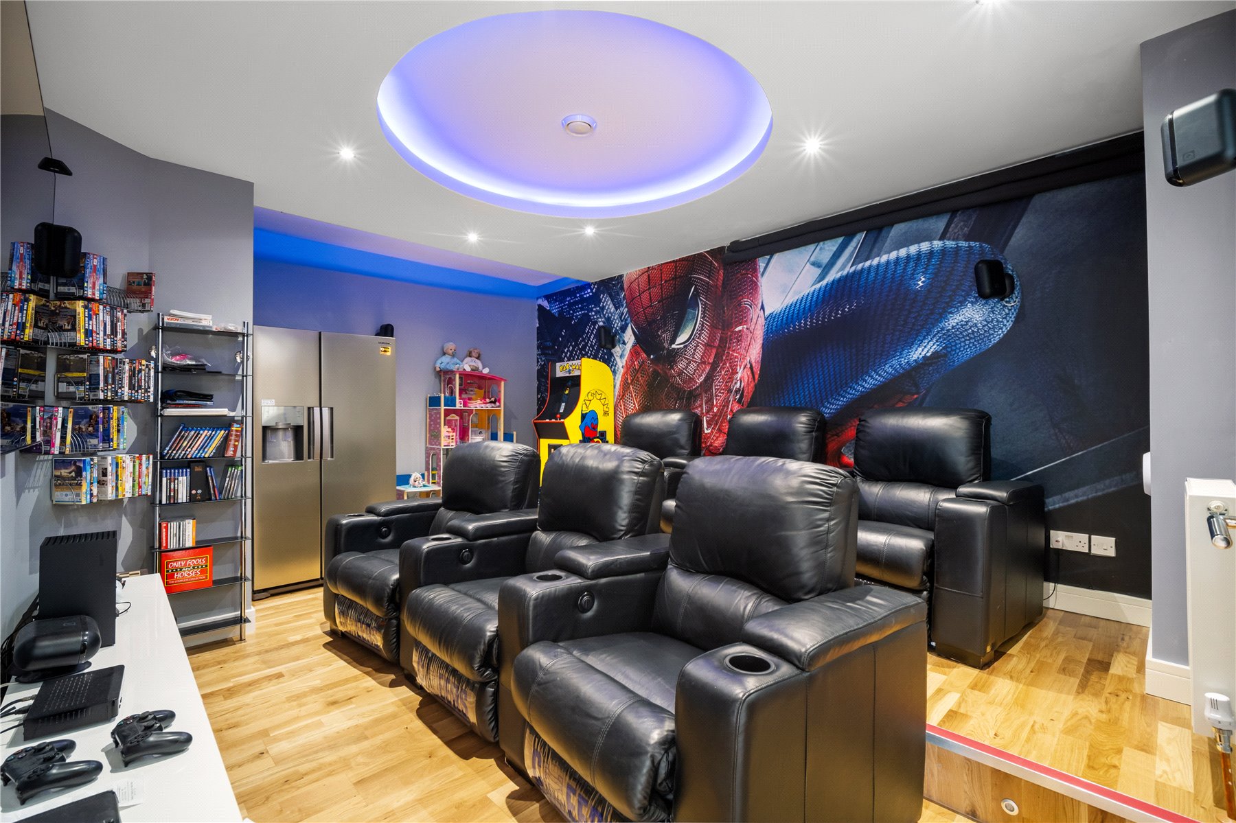 The reception hall leads to four double bedrooms with the PRINCIPAL BEDROOM having a bespoke walk-through dressing room and EN-SUITE SHOWER ROOM with shower cubicle, vanity unit, pedestal wash hand-basin and low level W.C. From here, double doors lead out to gardens. BEDROOM TWO has a second EN-SUITE SHOWER ROOM with a large shower, pedestal wash hand basin and separate W.C. BEDROOOMS THREE AND FOUR are both double rooms and share a luxury fully fitted GUEST BATHROOM with feature bath, vanity wash hand-basin, shower and low level W.C. Returning to the entrance hall and just prior to the stairs, a door leads into an individual state-of-the-art CINEMA ROOM with luxury seating and high specification integrated technology.