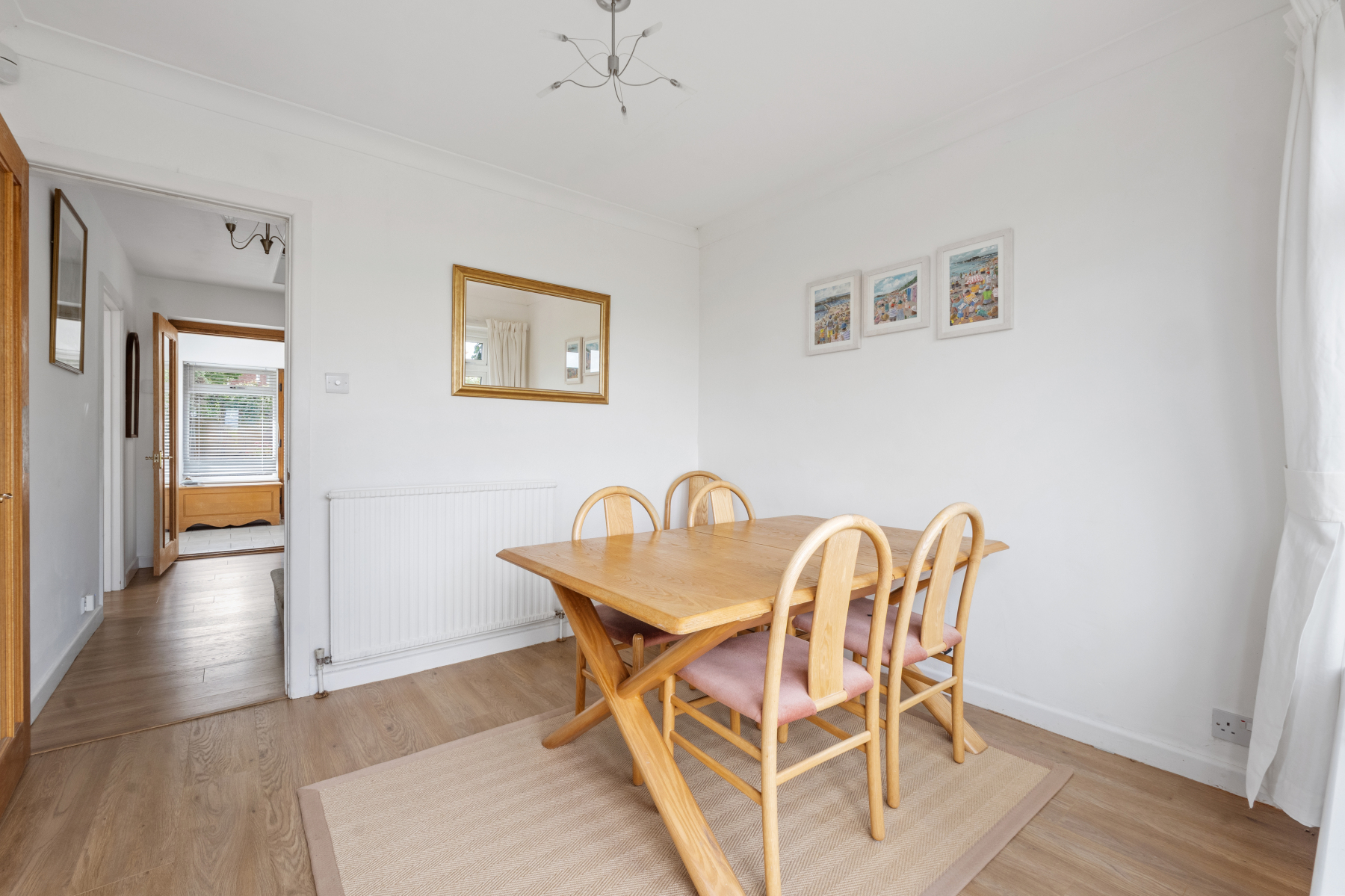 The home welcomes you via a sizeable, tiled ENTRANCE HALL, naturally bright thanks to its dual-aspect windows, offering the perfect space for sandy shoes and muddy wellie boots. This leads into a light-filled HALLWAY with an attractive timber and wrought iron staircase rising to the first floor.