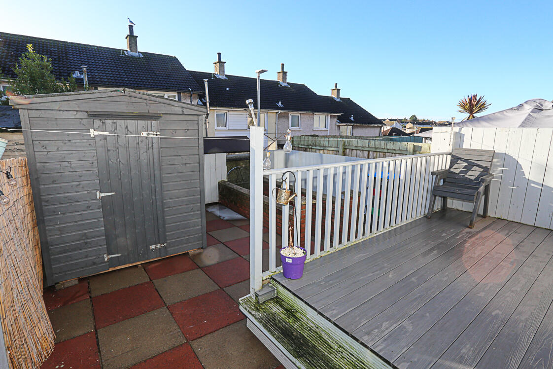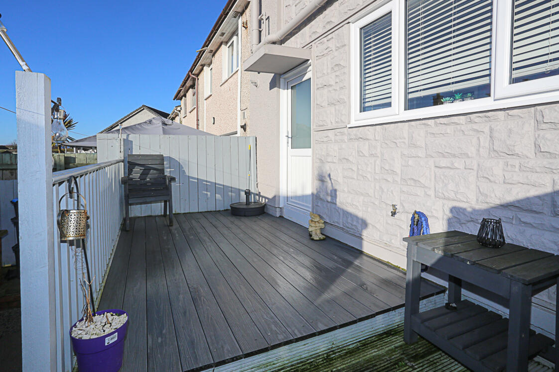 Rear Garden - Partially laid in decking, outdoor hot and cold taps, outdoor paved area with access to rear, uPVC soffits and fascias.