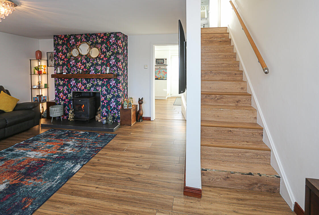 The accommodation begins with a uPVC double glazed entrance door opening directly into a comfortable and welcoming lounge with an outlook to the front. This well-appointed living space features a space for a wood burning stove on a tiled hearth with a floating timber mantel, with the potential to create a warm focal point ideal for everyday living.