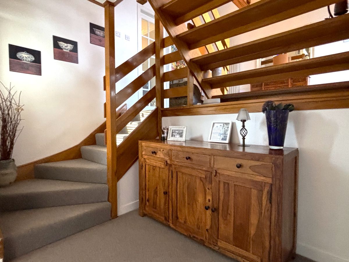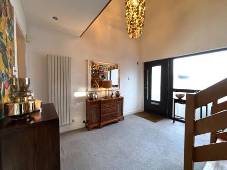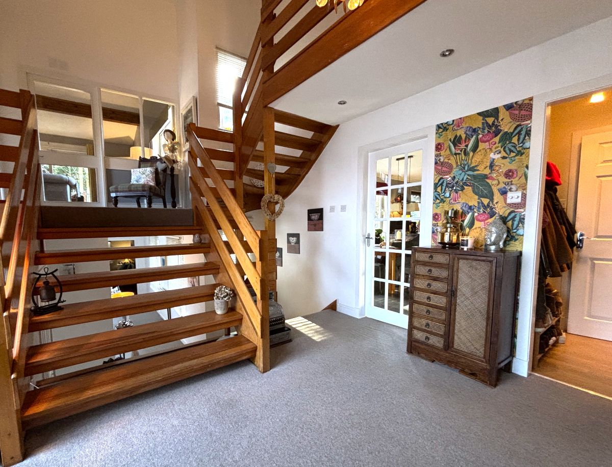 The property opens into a striking reception hall featuring a vaulted double-height ceiling, creating an immediate sense of space and light. From here, access is provided to all levels of the home. A convenient cloak cupboard and ground-floor WC are located off the hallway.