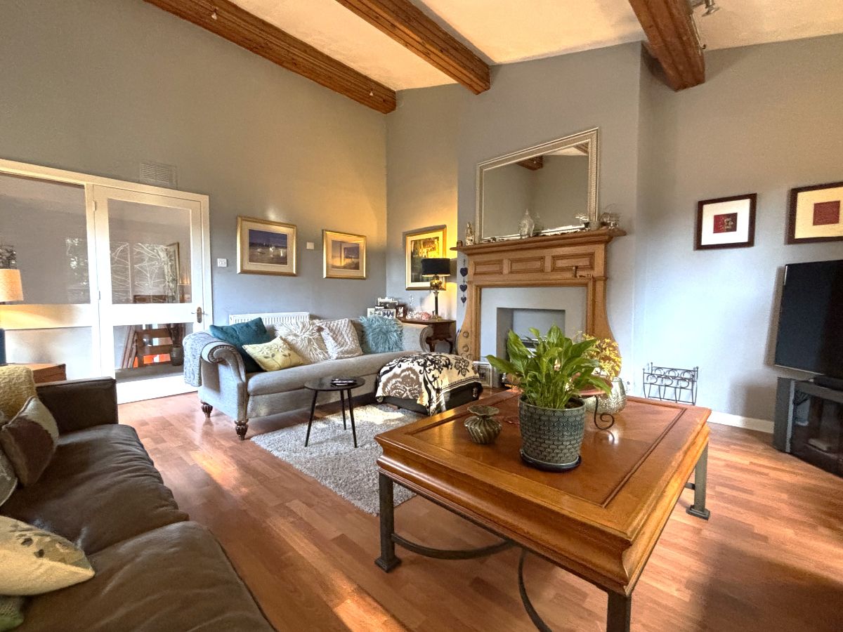 Stairs from the hall rise to a half-landing where a versatile study is located, which could alternatively be used as a fifth single bedroom if required. A glazed door then opens into the impressive main lounge, featuring a character fireplace, exposed timber beams and attractive views over the garden. Patio doors lead out to a sun terrace, providing the perfect setting for outdoor dining and family entertaining.