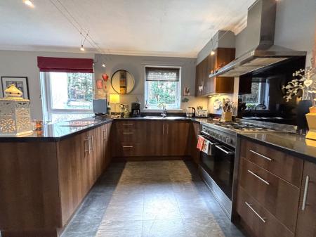 A glazed door leads into the contemporary open-plan kitchen and dining area. The kitchen is well equipped with an excellent range of storage units and generous worktop space, complemented by a range cooker and two separate sinks, making it ideal for both everyday living and entertaining. A further door leads to the utility room, providing additional storage and practical workspace, with external access to the rear garden and direct access to the double garage.