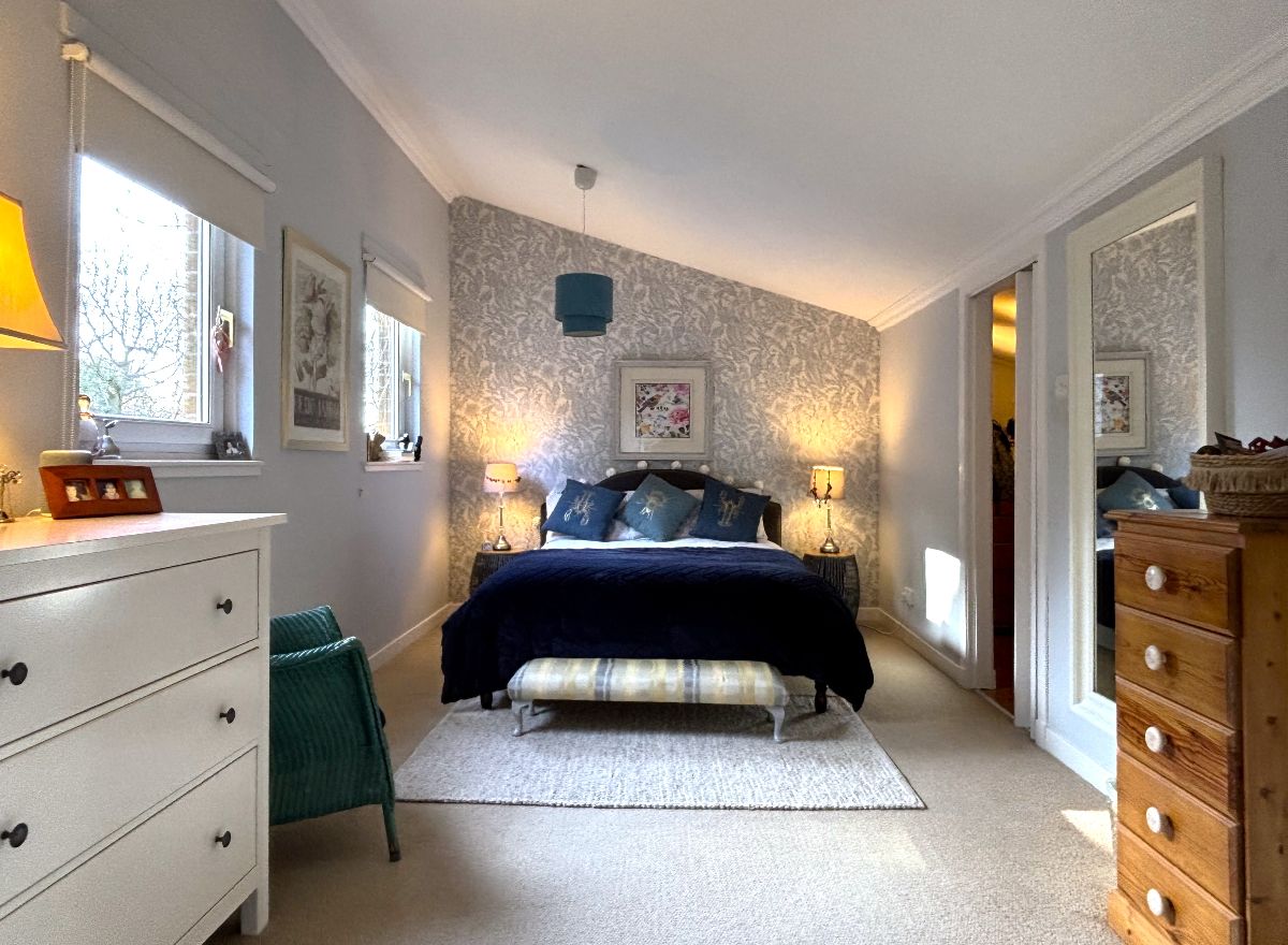 The upper level hosts the beautifully presented principal bedroom, filled with natural light from three windows. This elegant space also benefits from a generously sized walk-in wardrobe accessed via bi-fold doors.