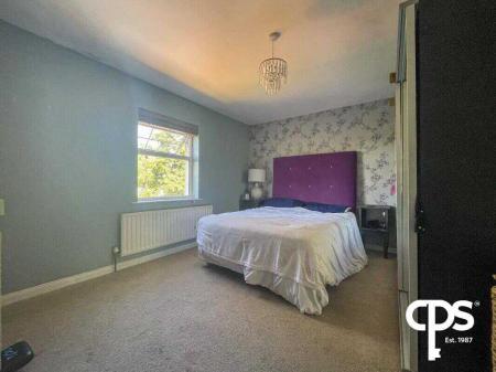 Bedroom 3 – 3.35m x 4.23mSpacious rear-facing double bedroom with carpet flooring, radiator, and built-in wardrobe space.