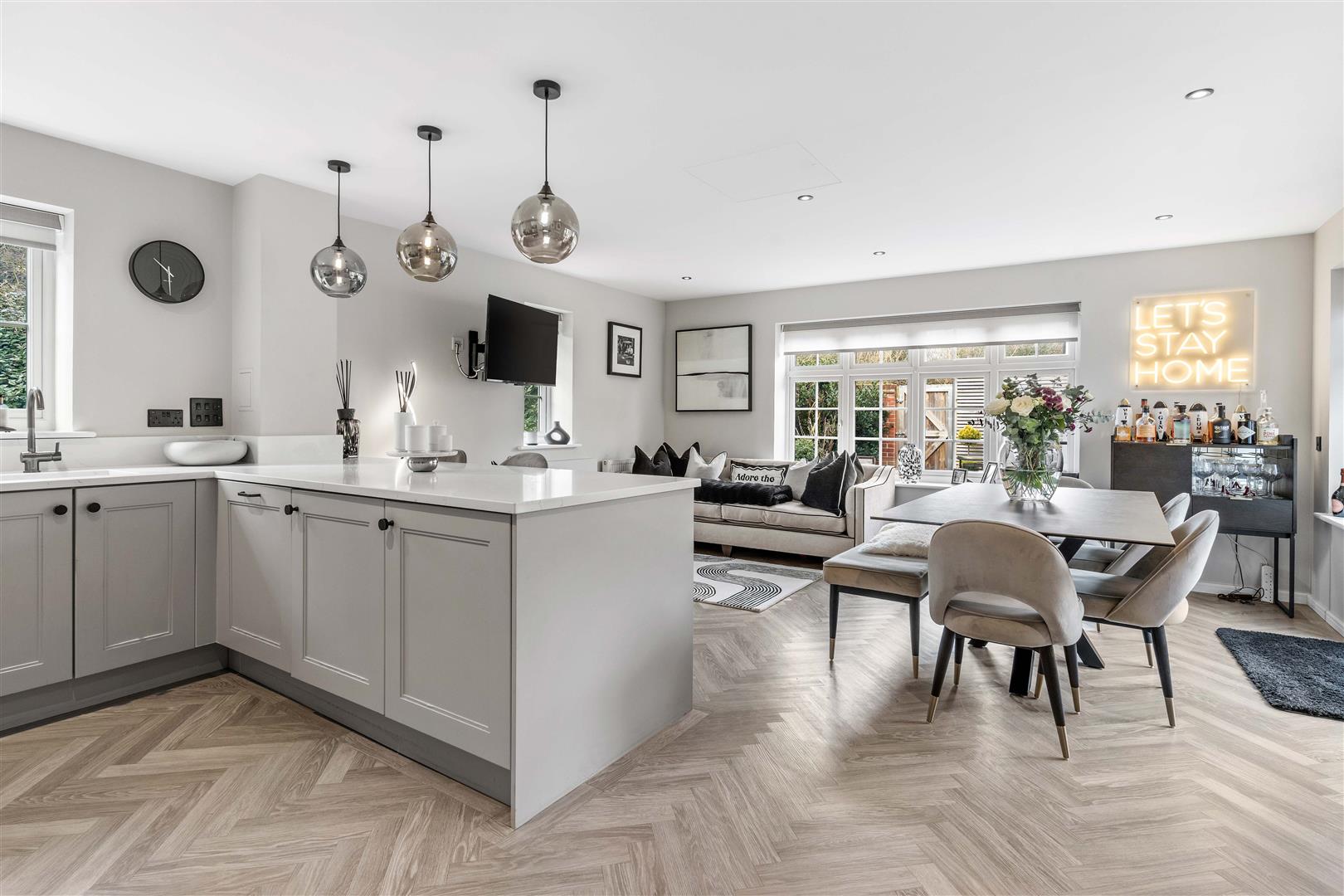 Kitchen/Dining/Family Room - UPVC double glazed windows to multiple aspects, base and eye level units with Quartz working surfaces over & breakfast bar area, inset double oven, inset microwave, inset sink with mixer tap & drainer, integrated dishwasher, integrated fridge/freezer, integrated washing machine, inset spotlights, radiator, power points, herringbone style flooring, feature electric fireplace, UPVC double glazed French doors leading to the rear garden.