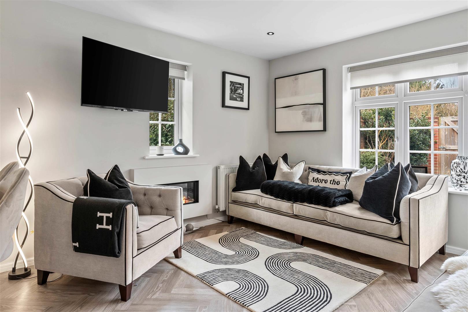 Living Room - UPVC double glazed window to front aspect with fitted shutters, UPVC double glazed full height windows to rear aspect,, UPVC double glazed French doors leading to the rear garden, feature media wall with space for inset T.V, feature electric fireplace, radiator, power points, T.V point.
