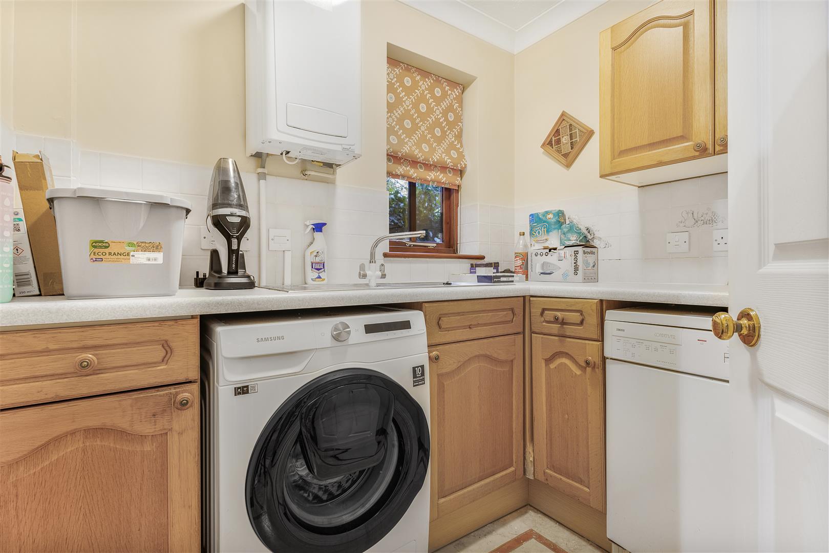 Utility Room - 2.2m x 1.6m (7'2" x 5'2") - Double glazed timber window to side aspect, access to gas boiler, various base and eye level units with worksurfaces over, single unit stainless steel sink with mixer tap and drainer unit, space for washing machine & separate tumble drier, splashback tilling, panel tiled flooring, ceiling mounted light fixture, various power points.