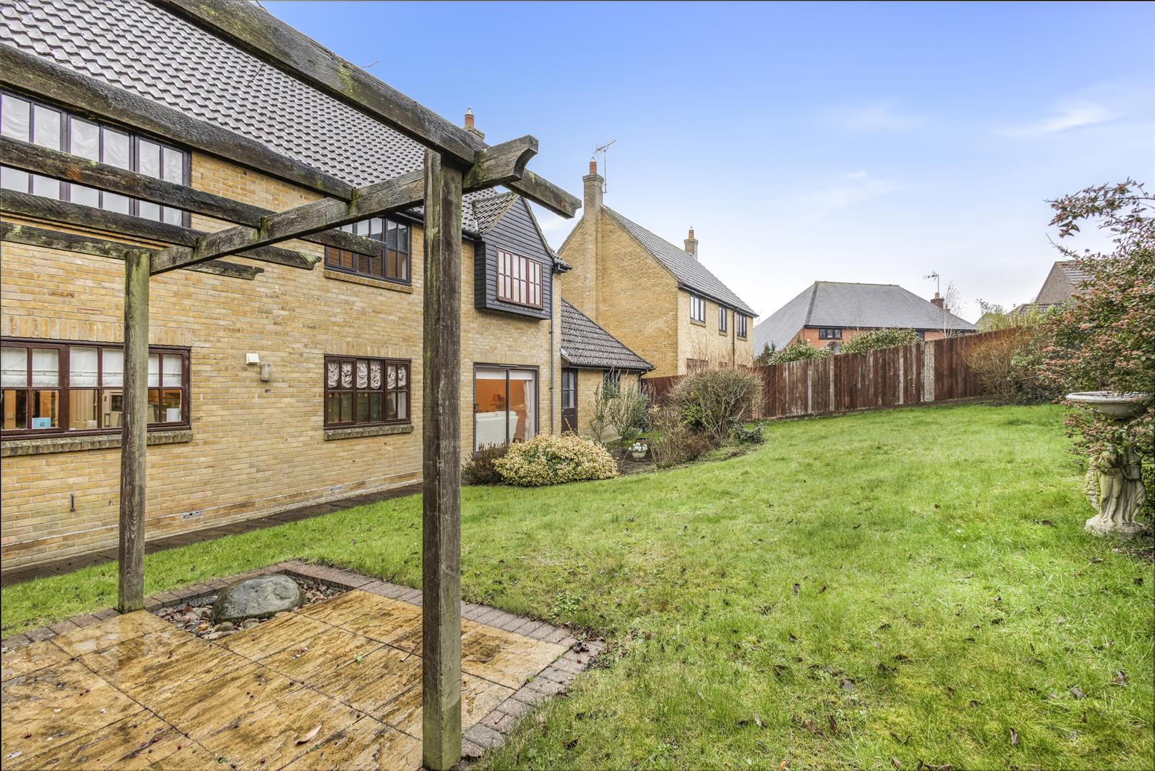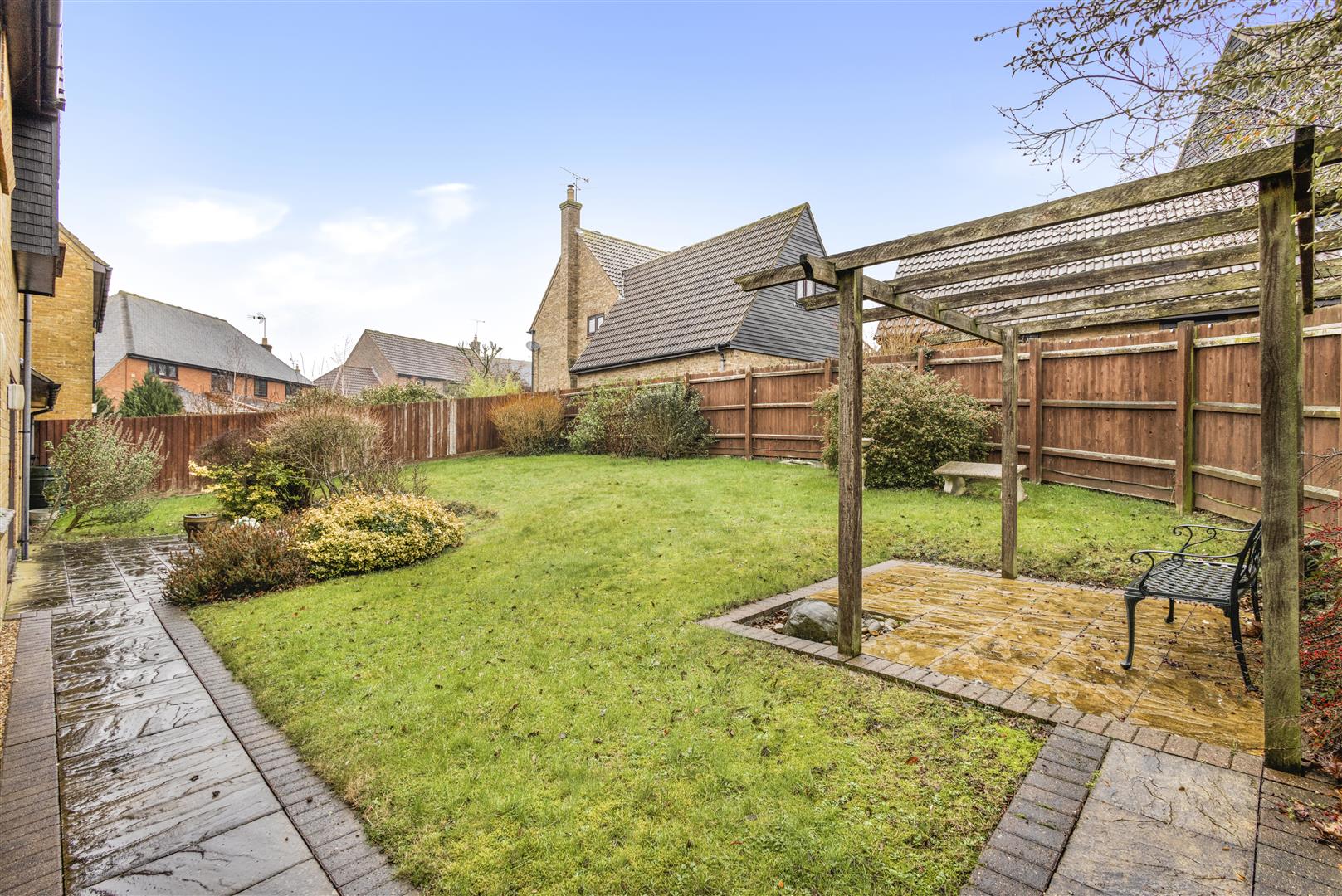 Gardens - Large rear garden on incline, with side gated pedestrian access, an entertaining patio area to the rear of the property, a further timber pergola seating area, various mature bushes and shrubs, all enclosed by timber panel fencing, To the front of the property is a porch and a retaining hedgeline.