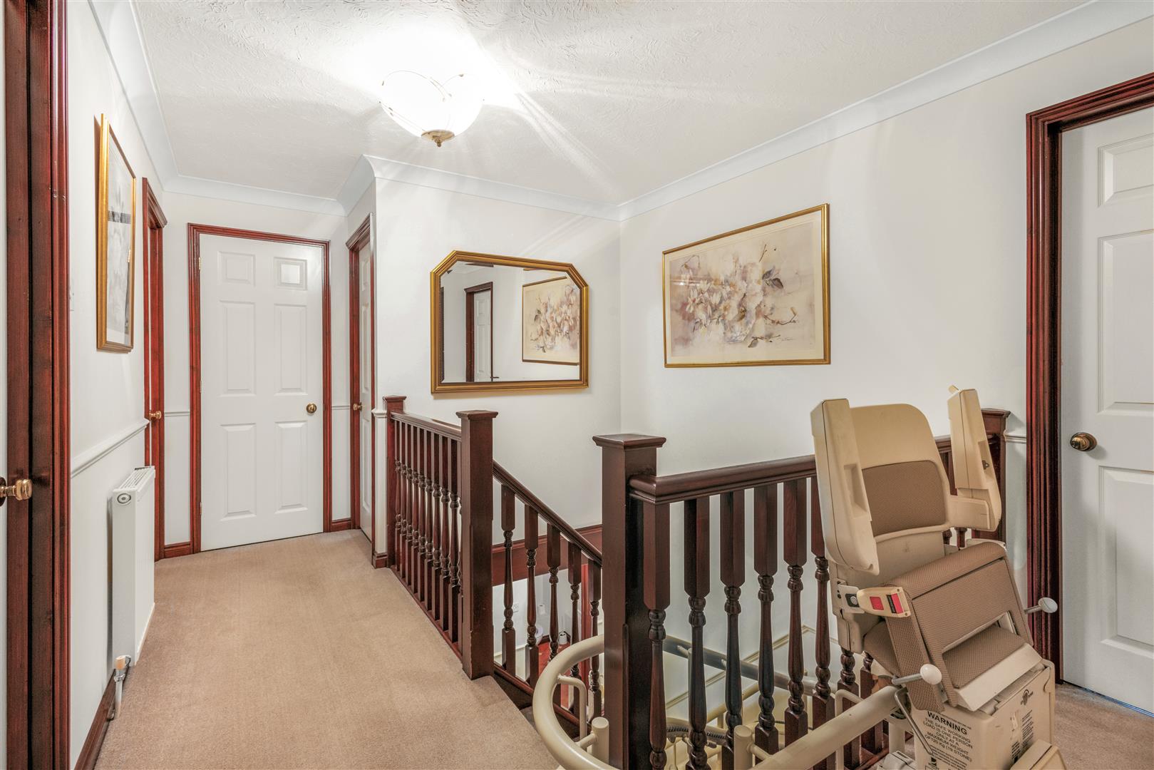 First Floor Landing - 4.2m x 2.8m (13'9" x 9'2") - Carpeted stairway with varnished timber banister, varnished timber balustrade, access to loft area, access to airing cupboard, wall mounted radiator, carpeted flooring, ceiling mounted light fixture, various power points. Doors to: Bedrooms, Family Bathroom.