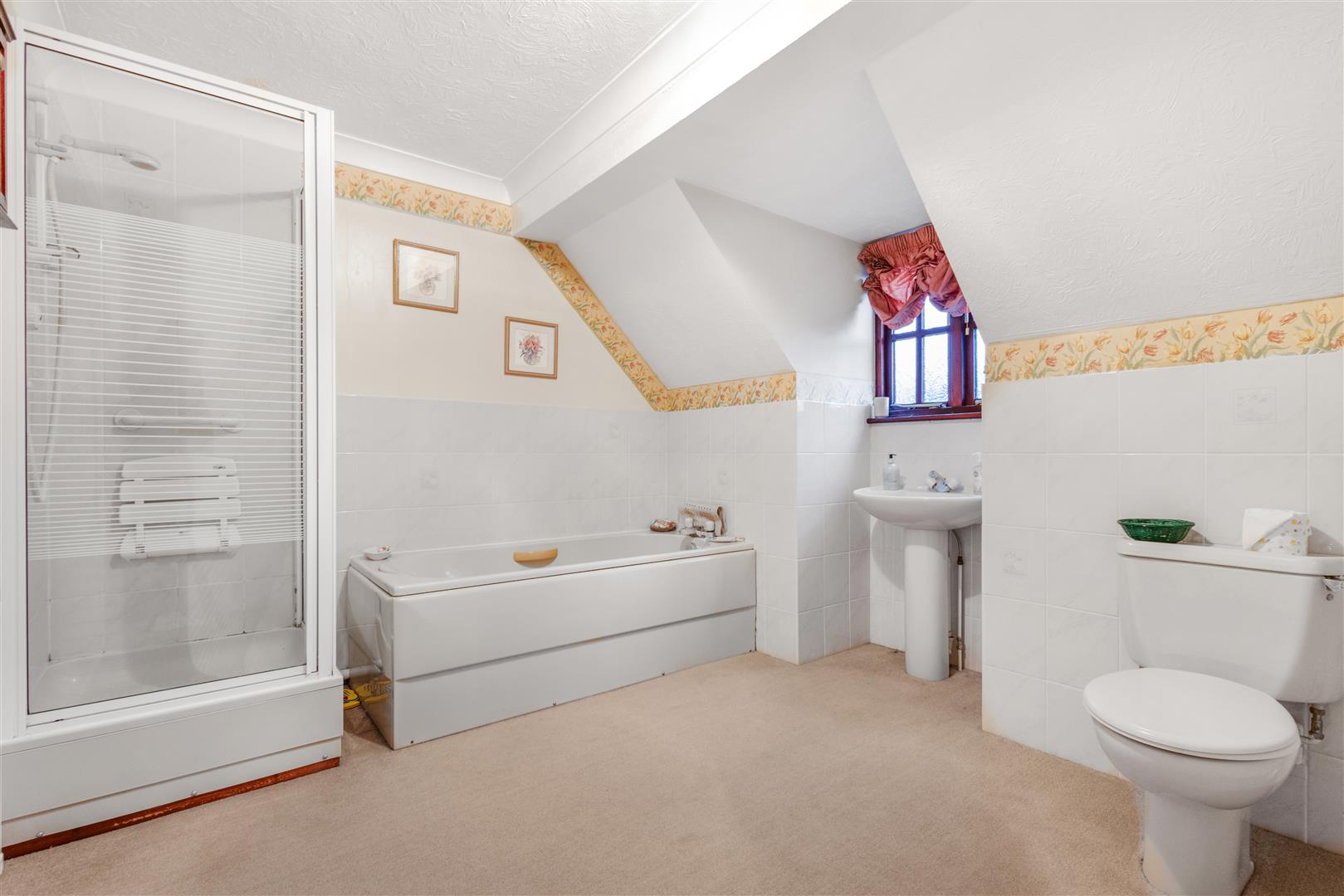 Family Bathroom - Double glazed timber Dormer window to front aspect, low level WC, four-piece suite, pedestal wash hand basin with mixer tap, panel enclosed bath with mixer tap, elevated cubical shower with glass door, wall mounted radiator, partially tiled walls, carpeted flooring, ceiling mounted light fixture.
