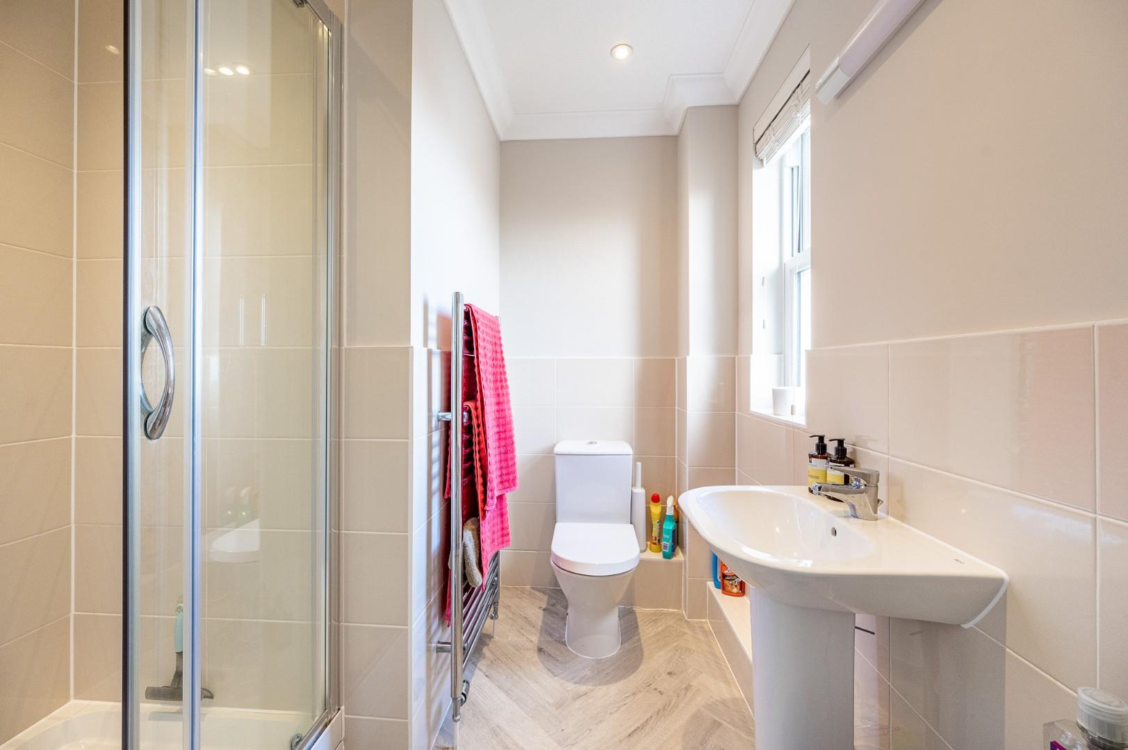 En-Suite - UPVC double glazed Sash Opaque window to rear aspect, enclosed shower with glass enclosure, wash hand basin with pedestal, W.C, heated towel rail, part tiled walls, herringbone style flooring, inset spotlights, extractor fan.