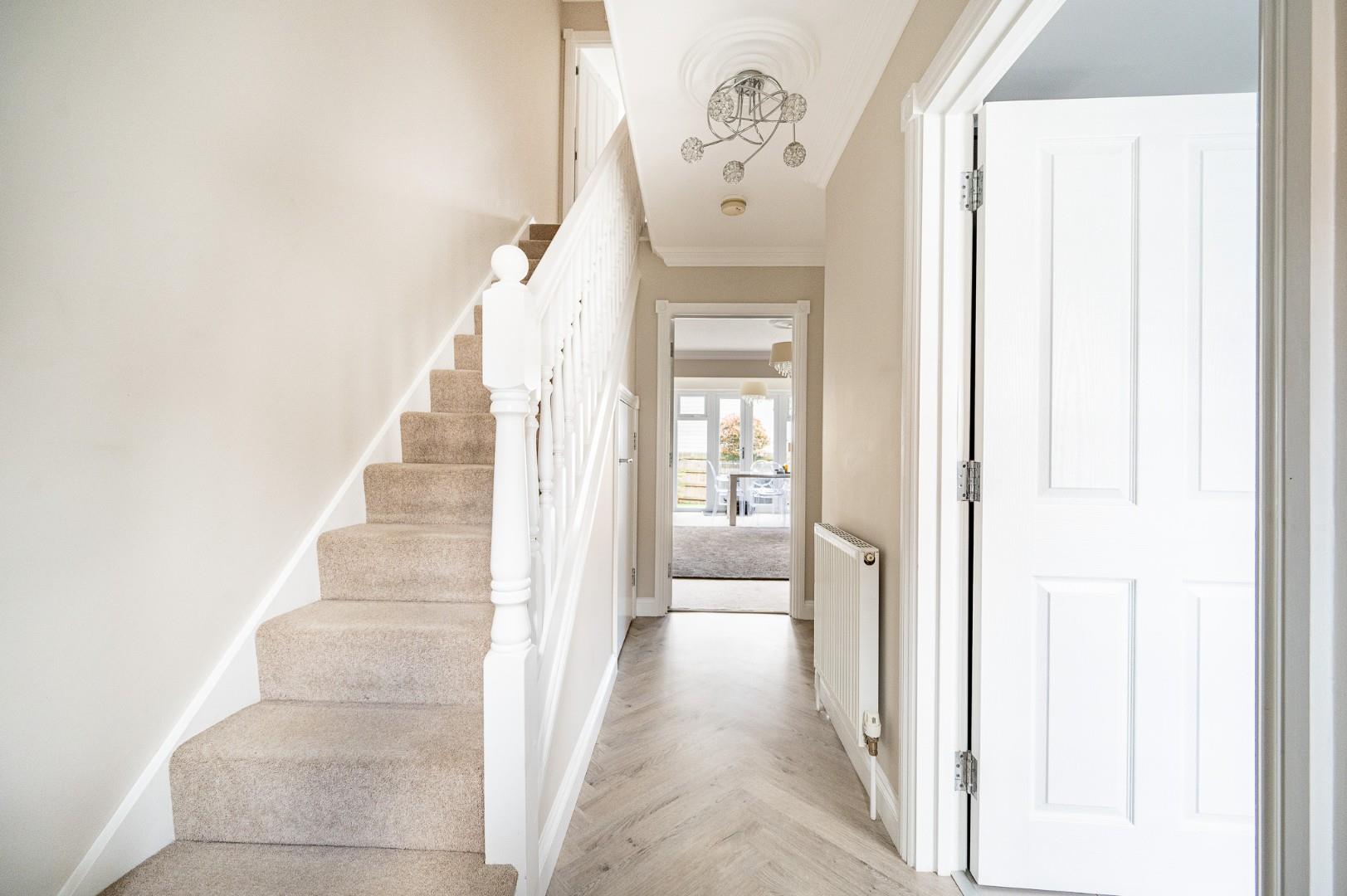 Entrance Hall - Herringbone style flooring, radiator, power points, stairs rising to the first floor landing, understairs storage cupboard, doors to.
