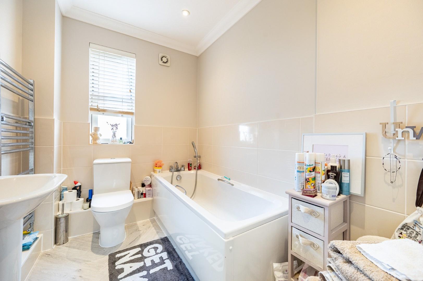 Family Bathroom - UPVC double glazed opaque window to rear aspect, enclosed bath with mixer taps & shower attachment, W.C, wash hand basin with pedestal, heated towel rail, inset spotlights, extractor fan, part tiled walls,, herringbone style flooring.