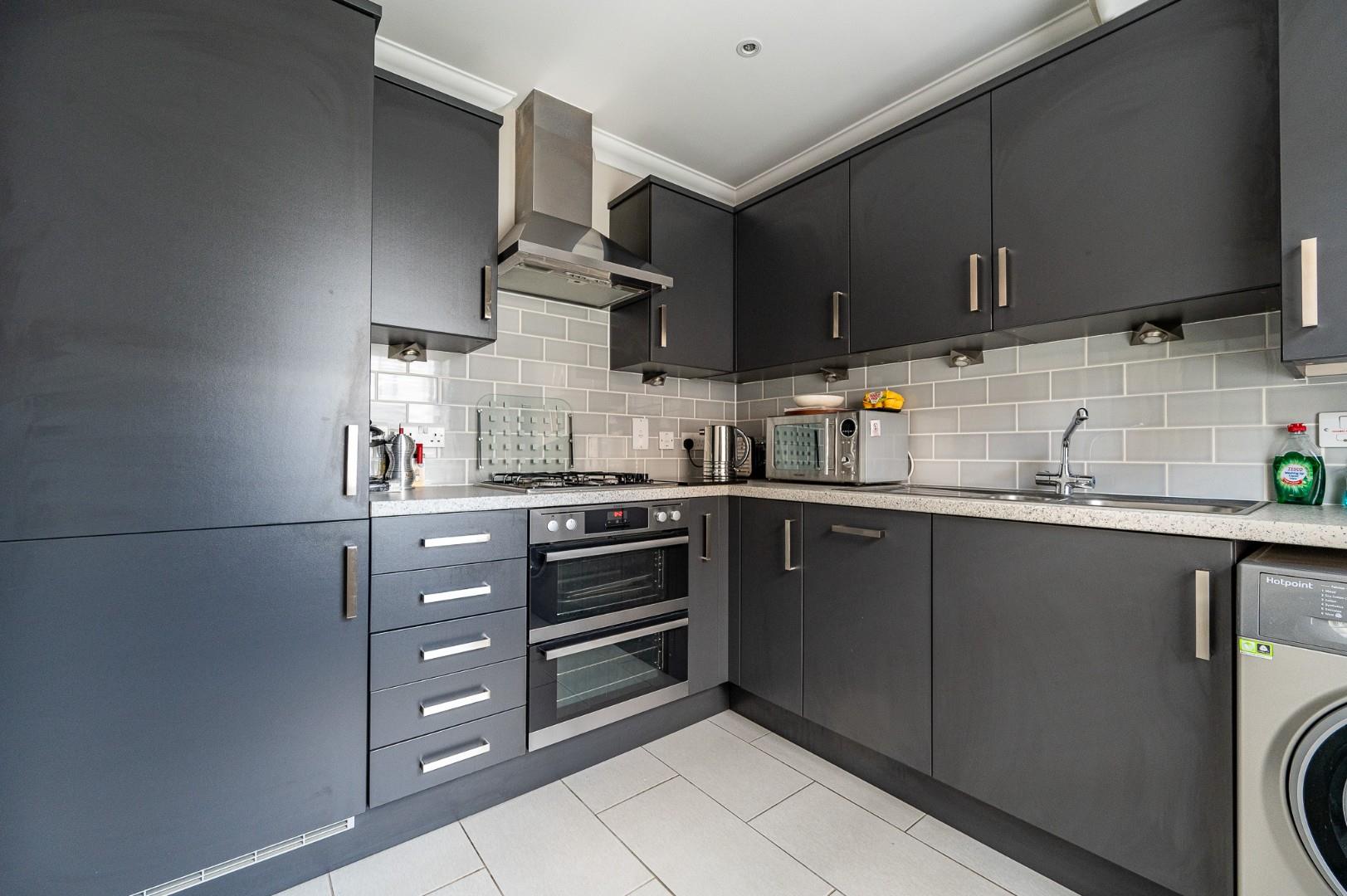 Kitchen - 2.69m x 2.44m (8'10" x 8') - UPVC double glazed sash window to front aspect, base and eye level units with complimentary working surface, 1 1/2 bowl sink with drainer unit, five ring gas hob with extractor over, inset double oven, integrated dishwasher, integrated fridge/freezer, space for washing machine, cupboard housing wall mounted boiler, feature lighting, inset spotlights, tiled flooring.