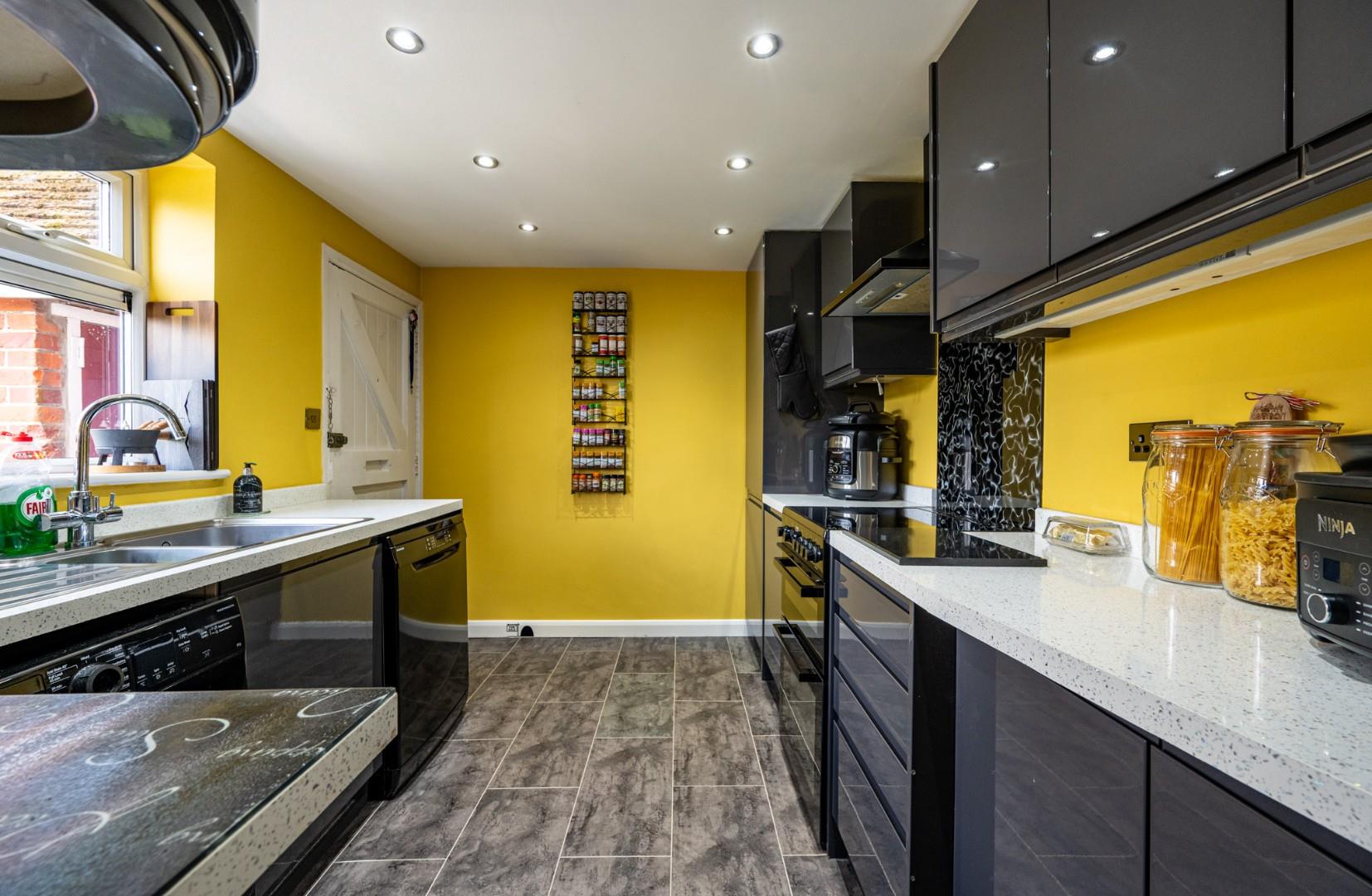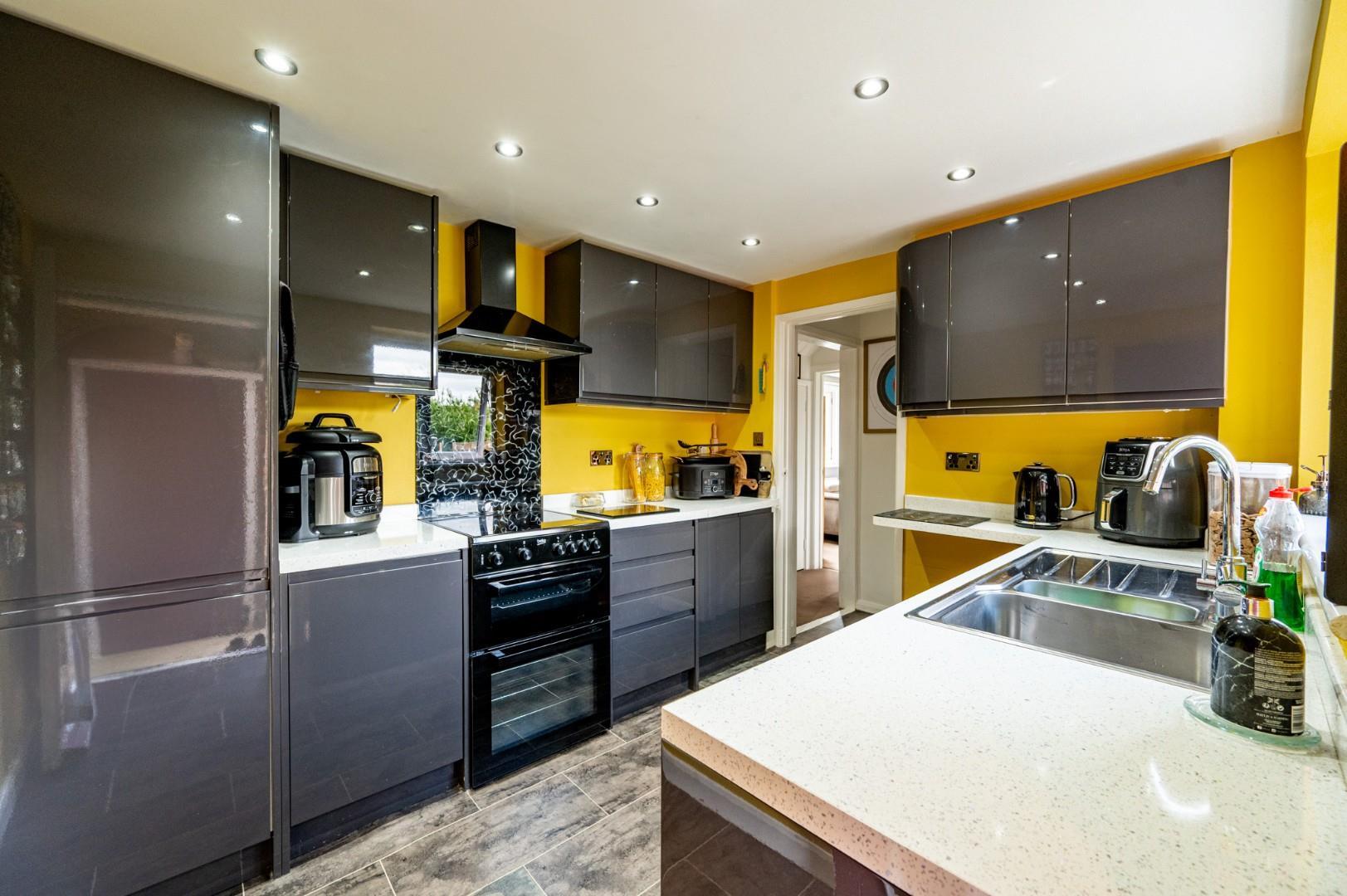 Kitchen - 3.126 x 2.554 (10'3" x 8'4") - Window to rear aspect, fitted with eye and base level unit with working surface over, inset sink and drainer unit with mixer tap over, integrated fridge/freezer, free standing cooker with four ring hob and extractor fan over, space for washing machine, space for tumble dryer, door leading to:-