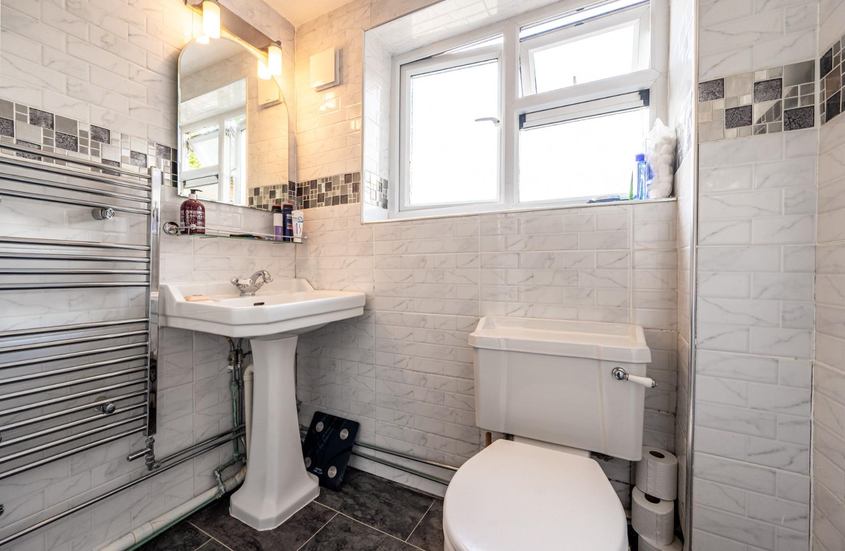 Shower Room - 1.998 x 1.829 (6'6" x 6'0") - Opaque window to rear aspect, fully tiled walls, fully tiled shower cubicle with glass enclosure, low level W.C, wash hand basin with pedestal, wall mounted heated towel rail, extractor fan.