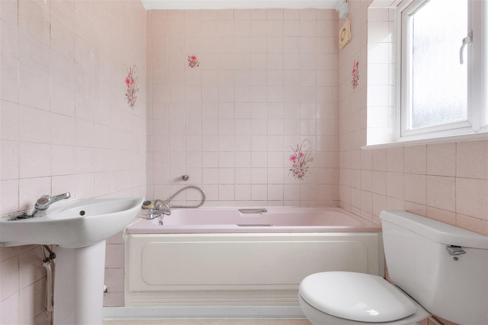 Family Bathroom - Frosted double glazed UPVC window to front aspect, three-piece suite, low level WC, panel enclosed bath, pedestal wash hand basin with mixer tap, vinyl flooring, ceiling mounted light fixture, extractor fan.