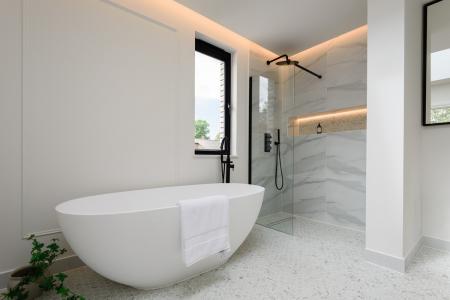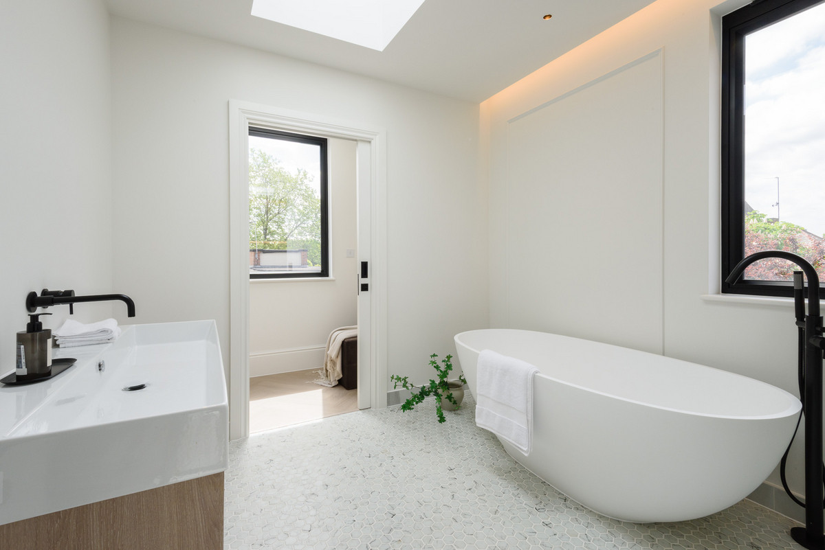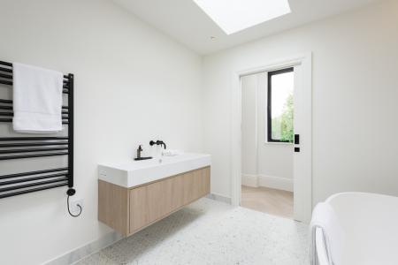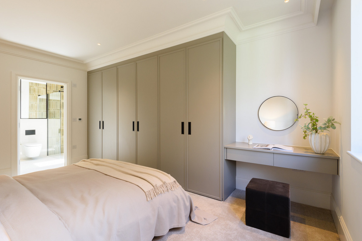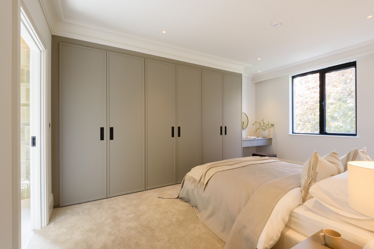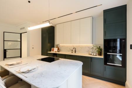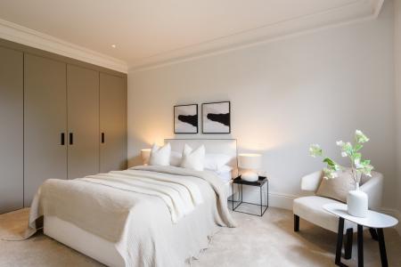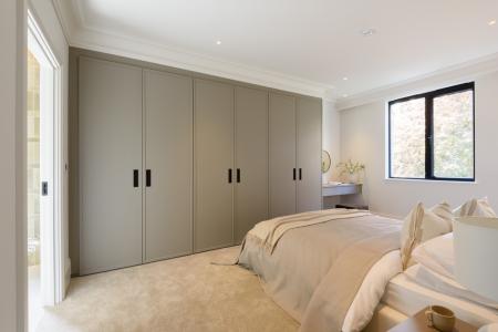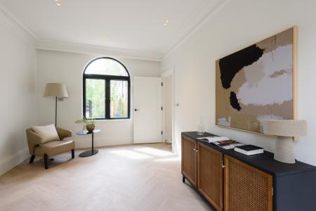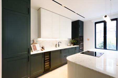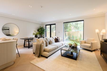 The open-plan living areas, bathed in natural light, flow seamlessly, providing the perfect setting for both entertaining and relaxation. The bespoke shaker kitchens, in a refined grey-green, feature ivory modern panelled islands, Miele appliances, marble-inspired worktops, and full splashbacks, catering to the most discerning chefs. Opulent wood detailing and matte black accents throughout lend an unmistakable air of refinement