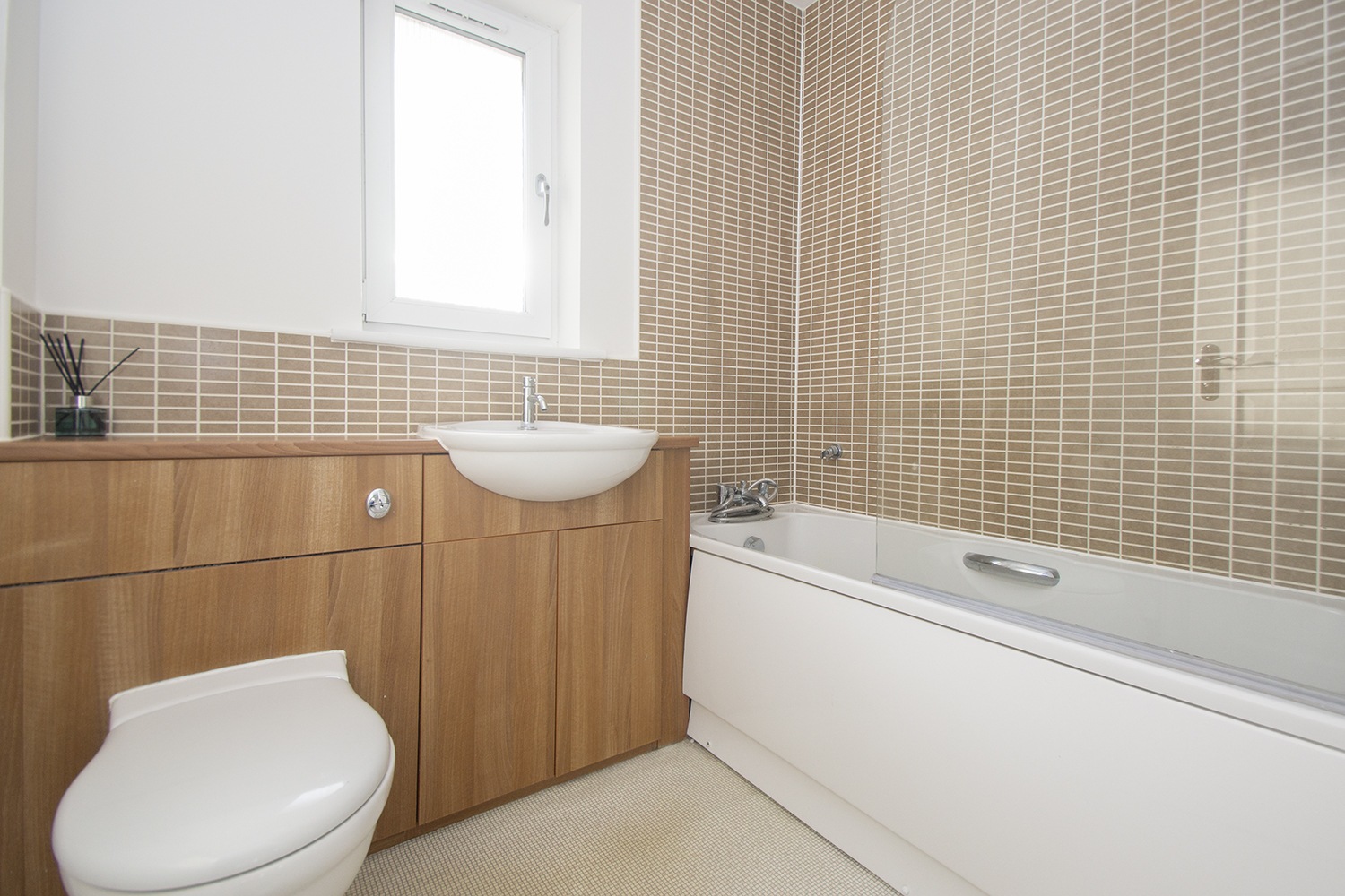 Contemporary 3 piece bathroom suite comprising wc, wash hand basin with vanity unit and bath with electric shower and screen. The bathroom benefits from mosaic tile splash-back areas and vinyl flooring.