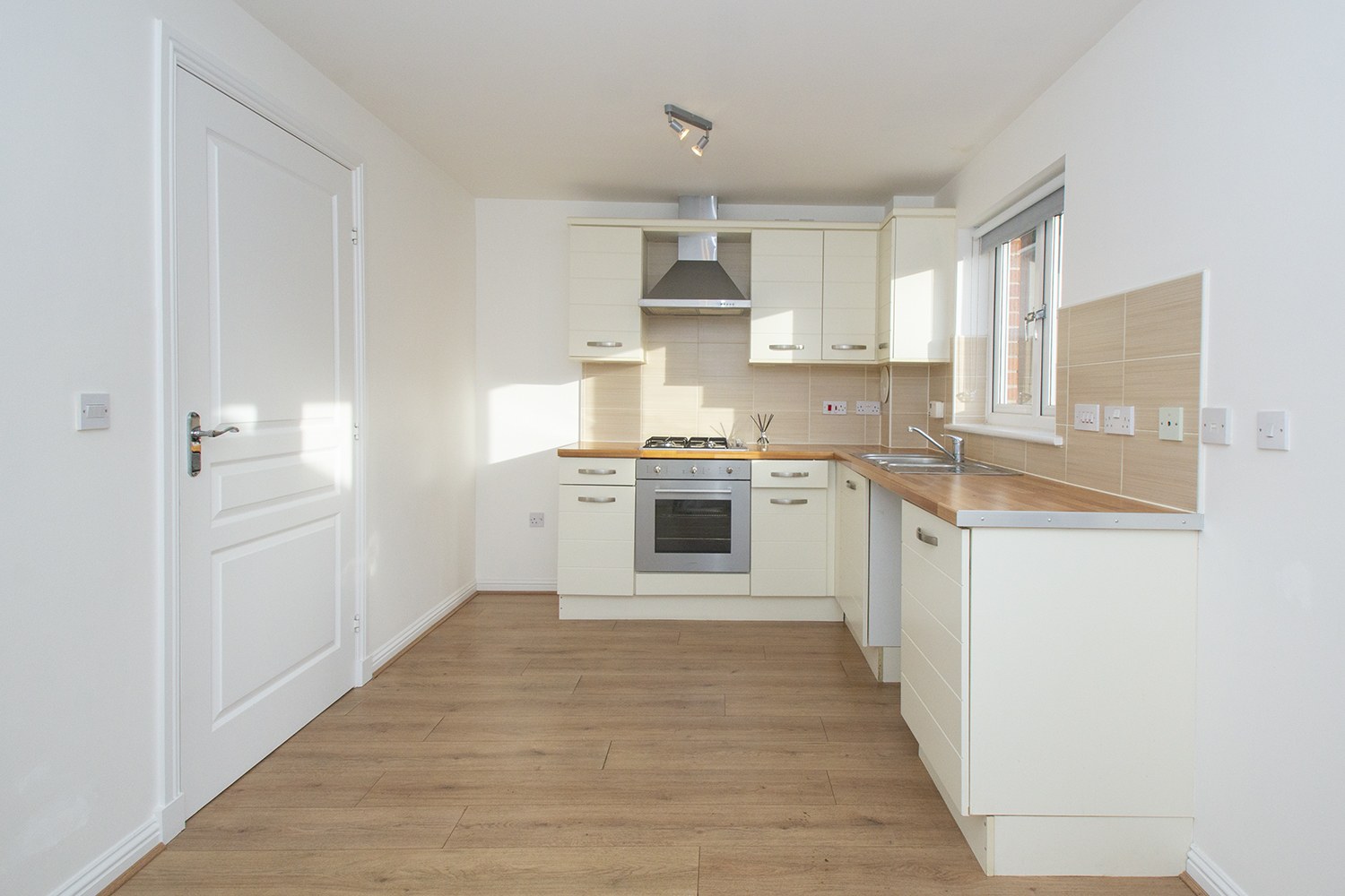 Modern fitted kitchen housing an ample range of base and wall units in cream with complementary worktops. The kitchen benefits from integrated stainless steel electric oven, gas hob and extractor fan, inset stainless steel sink with mixer tap, plumbed for automatic washing machine, quality vinyl flooring and tiled splash-back areas. The kitchen offers sufficient space for dining and access to the rear garden through double glazed French doors. Ample power points. Radiator.