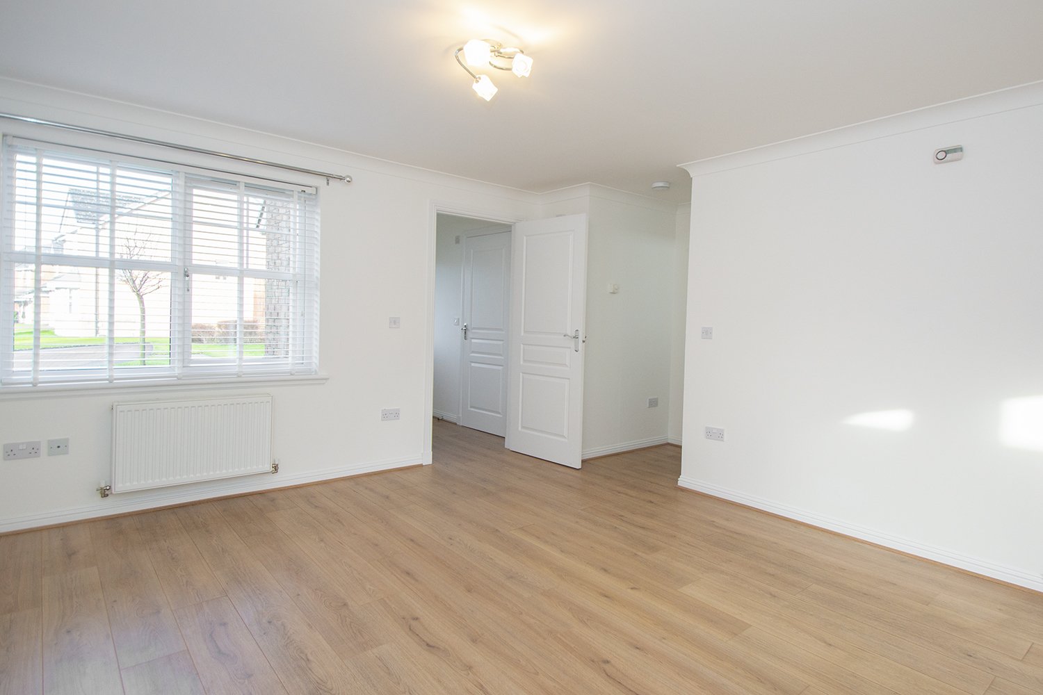 Bright neutral lounge with front facing outlook. The room benefits from laminate flooring, single pendant lighting, decorative coving, tv point and ample power points.