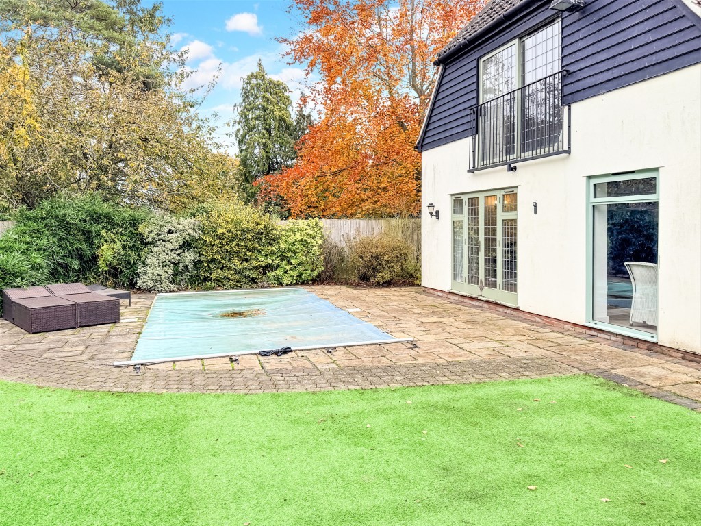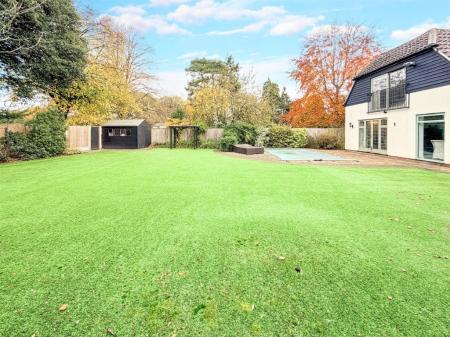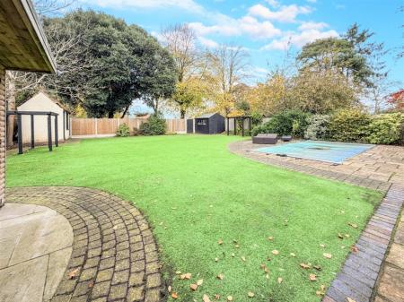 At the heart of the garden lies the heated swimming pool, complete with swim jets and surrounded by neatly landscaped borders. This feature creates a resort-like atmosphere, ideal for both family enjoyment and entertaining guests.
