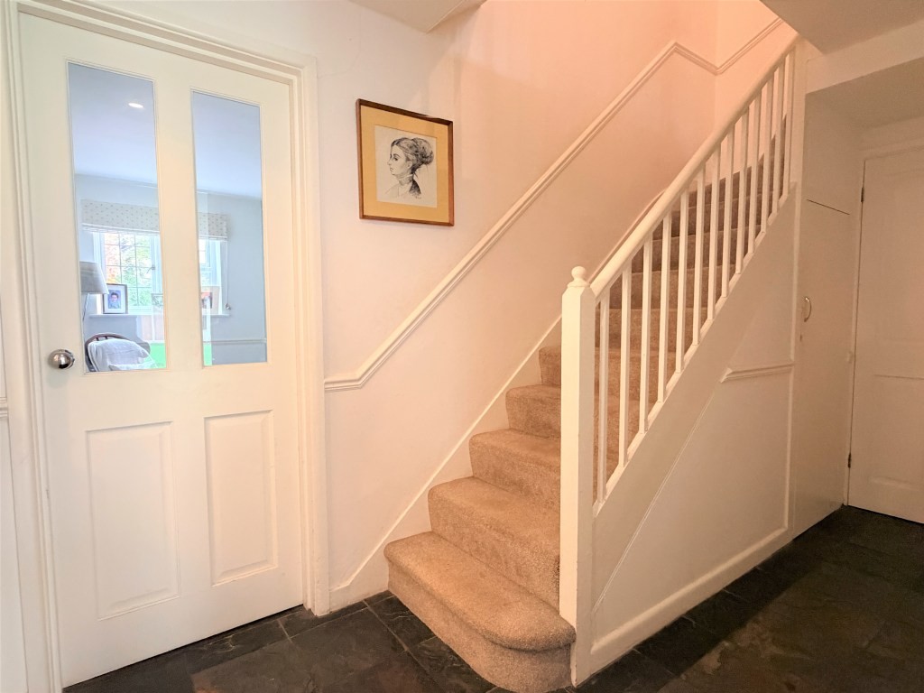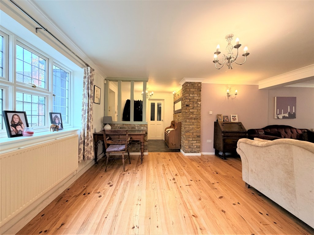 Inside, a welcoming entrance hall flows effortlessly into the dual-aspect living room-a bright, elegant space where natural light streams through full-height windows and double doors overlooking the garden. An inset wood burner brings warmth and atmosphere during cooler months, creating an inviting focal point for family gatherings.