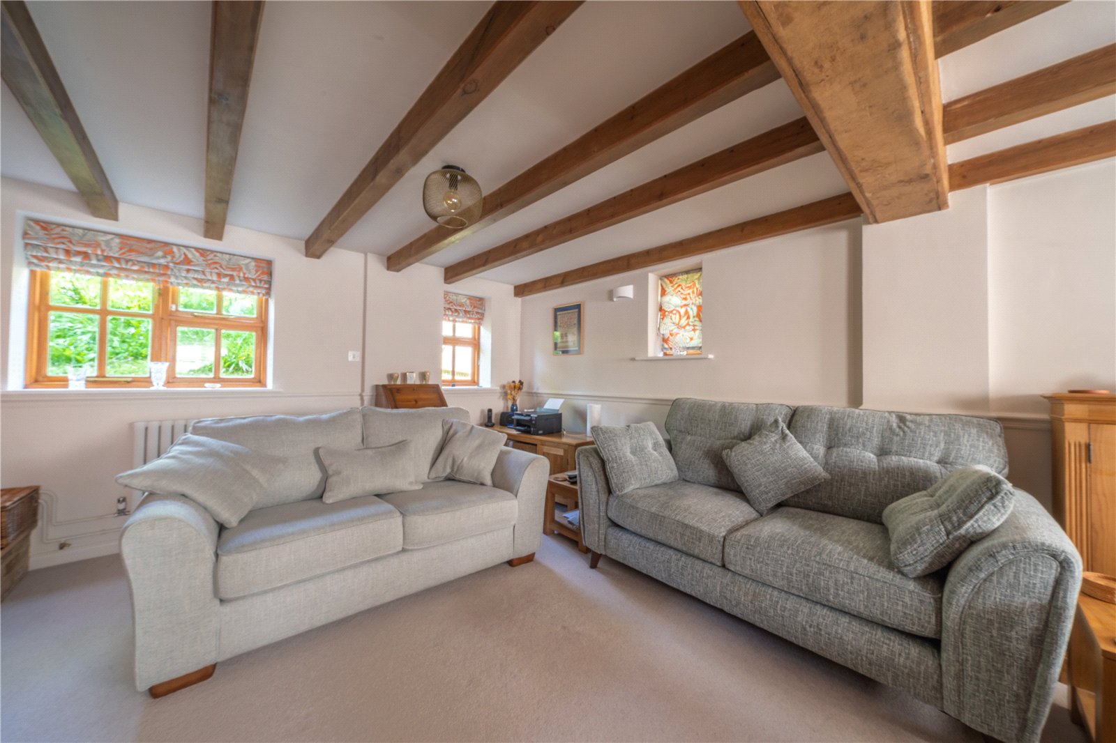 BEDROOM TWO: A double-sized and double aspect room with exposed beams to the ceiling, hatch to storage, radiator, double glazed cottage-style windows with aspect to side and rear cottage gardens and views over the adjoining farmland.